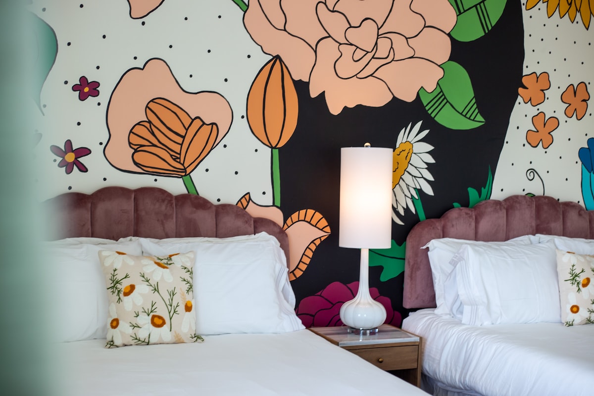 The Hideout is thoughtfully designed to provide a dark and cozy atmosphere. With its accommodating two queen beds, this suite can comfortably accommodate up to four guests. The character of the room is much different than the rest, offering a more masculine and sophisticated impression. Whether you're traveling with friends or family, the Hideout room provides a welcoming retreat where you can fully recharge and relax.