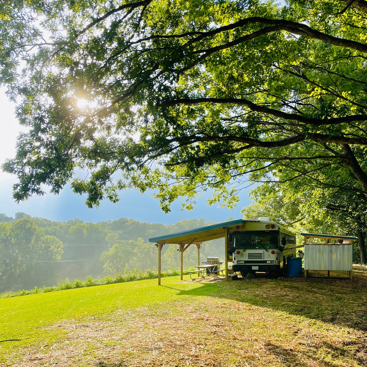 This solar powered school bus "Schoolie" tiny home is nestled under open skies, near the forest, with a lake front view, a full bed, kitchen with two burner stove & sink, & a cozy couch. Bliss in the heart of the Shawnee National Forest on Interwoven Permaculture Farm, in Lusk Wilderness. Enjoy star gazing, swimming, and campfires. The chorus of nature will lull you at night, & greet you in the morning. It's a beautiful place to wake up! With kitchen, AC/Heater, this is ultimate glamping!!!
