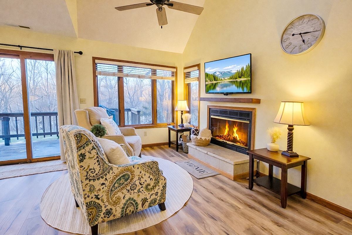 ⭐King bed with plush bedding in a peaceful, private setting ⭐Wood-burning fireplace — perfect for cozy evenings together ⭐2-minute drive to the North Golf Course, driving range, & Stonedrift Spa ⭐Wooded nature views & tranquil surroundings for a relaxing escape ⭐Just 12 minutes to downtown Galena — excellent shopping, dining, & sight-seeing ⭐Access to Owner’s Club amenities including indoor pool & fitness center ⭐15 miles to Chestnut Mountain ⭐2 Full bathrooms & newer full size sofa bed