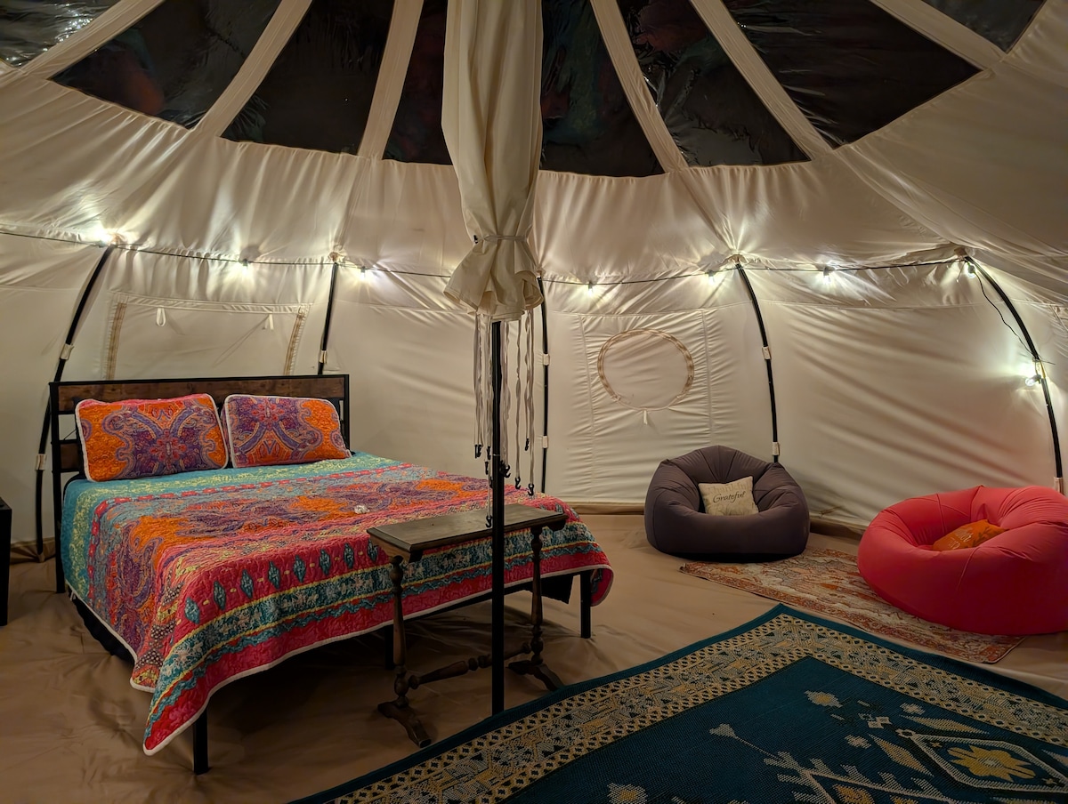 Reconnect with nature at this unforgettable escape. Huge 16 foot Jellyfish Tent on lawn for 2 Guests or 4 if you use the floor. Full RESTROOM at Farm Learning Center. Milk the goats, cuddle chickens. Hiking trails, creek, playground, gardens, farm animals, & educational tours. Great for folks who are skeptical of "bring your own tent and sleep on the ground" camping. Details at "www--Hungry World Farm---com" NOTE! This tent has changed from Yurt-style to Jellyfish style. Interior pics soon!