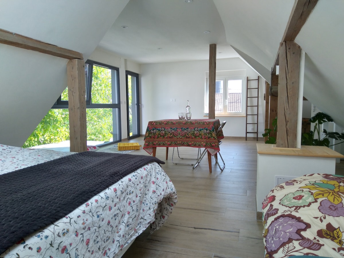 Profitez d'un logement élégant et central. Appartement type loft de 40 m2 aménagé avec goût et bien équipé (home cinéma, salle de fitness) situé dans une maison avec accès et parking privatif. il est situé à 15 minutes en voiture de Strasbourg, à 5 minutes de l'aéroport, à 5 minutes de l'autoroute avec les moyens de transport à proximité : gare à 300m (Strasbourg à 7 minutes, aéroport à 5 minutes) , arrêt de bus à 150 m.
