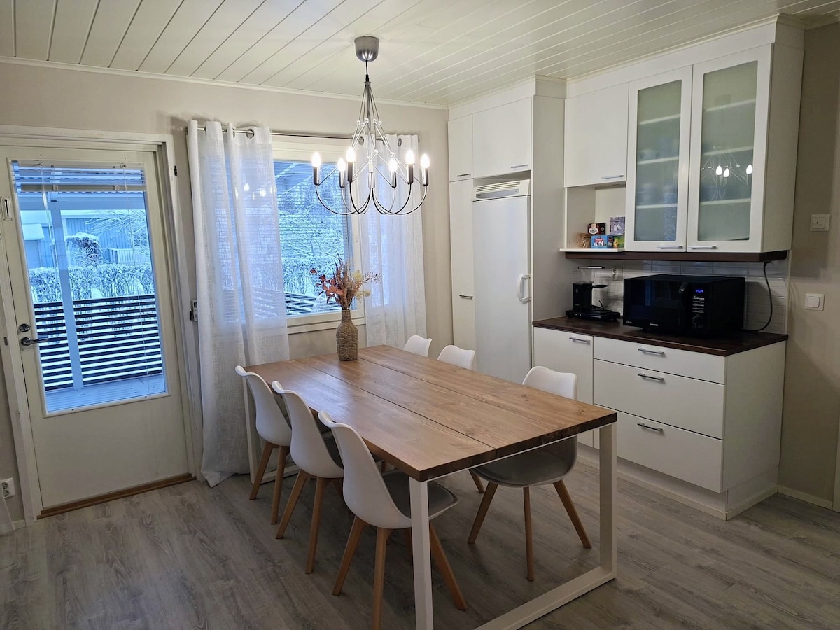 Villa Flora is a spacious, cozy, and home-like 150m² two-story accommodation, perfect for a relaxing getaway or small gatherings. Comfortably sleeps up to 10 guests – 5 beds, 5 extra beds, and a baby crib on request. A fully equipped kitchen (including champagne glasses), a sauna for relaxation, and a washing machine for convenience. Prime location in Kauhajoki center – shops, restaurants, and the church are just a short walk away.