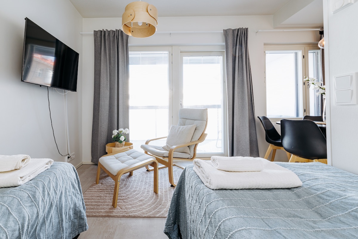 Moderni yksiö saunalla ydinkeskustassa – 300m asemalta. Nauti viihtyisästä ja hyvin varustellusta yksiöstä loistavalla sijainnilla keskustassa. Rautatieasemalle vain 3 min kävely. ✨ Mukavuudet: • Sauna • Familonin hotelli sängyt • Smart TV & nopea WiFi • Pyykinpesukone ja kuivausrumpu • Laadukkaat liinavaatteet & pyyhkeet 📍 Sijainti: • Rautatieasema 300 m • Kaikki keskustan palvelut kävelyetäisyydellä Täydellinen valinta työmatkalle tai lomalle – helppoa ja mukavaa majoittumista