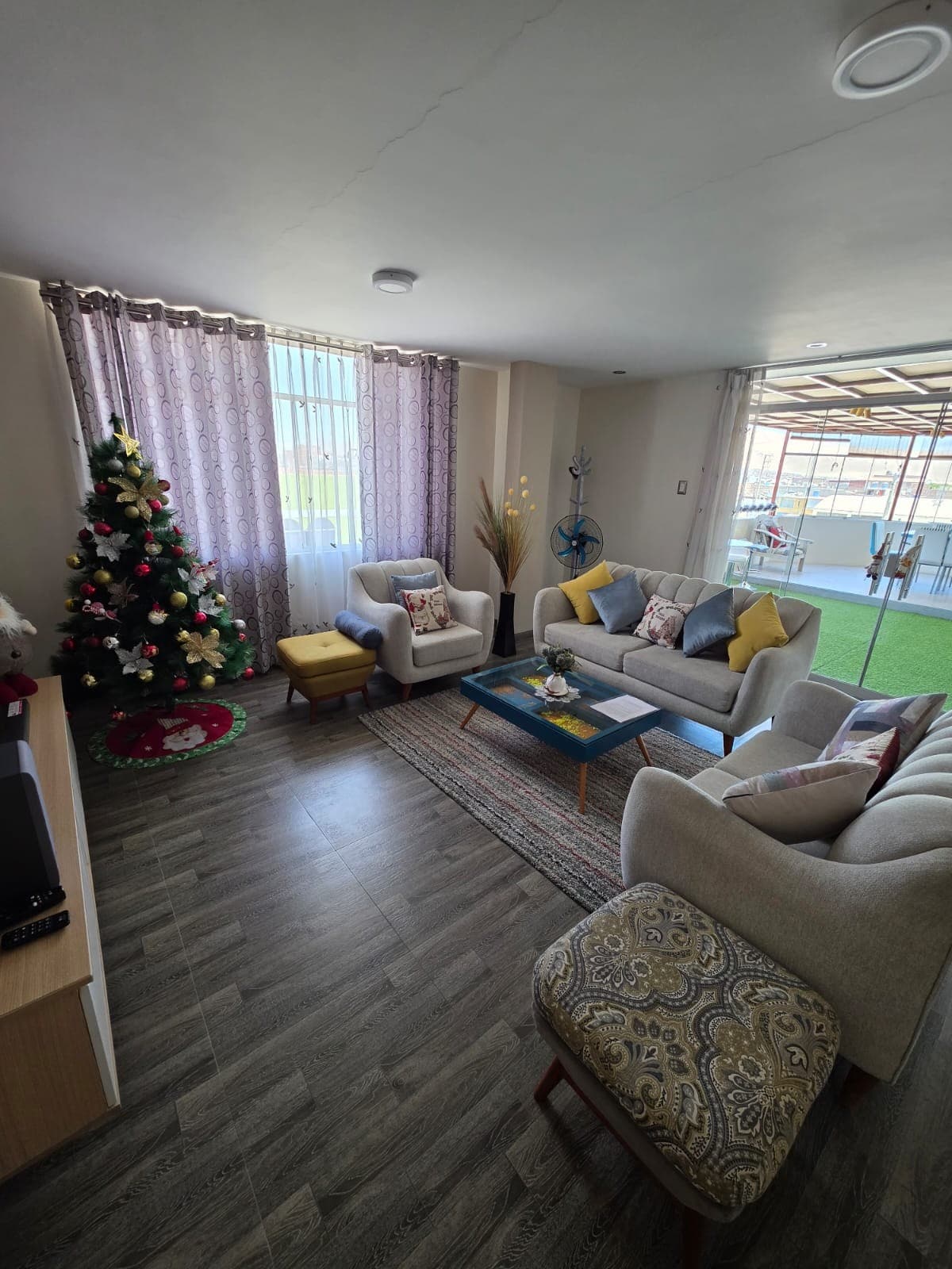 Un lugar relajante a 10 minutos del centro ubicado en zona residencial con seguridad, cuenta con 2 habitaciones cama 2 plazas y 2 camas plaza y media 1 baño con therma, sala comedor con cómodos y modernos muebles con sofá cama televisores de 44" y 36" zona de lavandería con lavadora, cochera privada, cocina equipada con microondas refrigeradora de dos puertas olla arrocera, cafetera y menaje Parrilla y zona de terraza Cuenta con wifi Ideal para 04 personas sujeto a variación del cliente