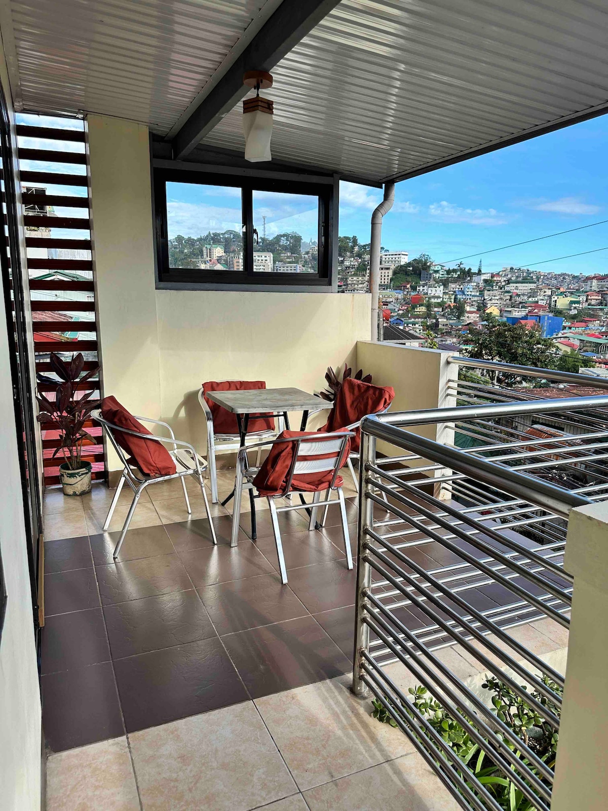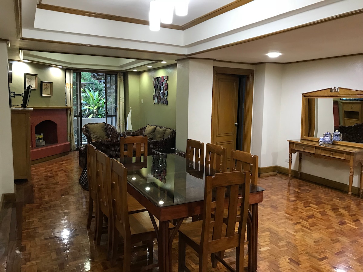 This is a gorgeous two bedroom/ two bathroom apartment. It has a masters bedroom with a queen size bed. The 2nd room is a family bedroom, furnished living area and comes with equipped kitchen, propane provided for cooking, WIFI, Cable TV, CCTV, complimentary drinking water, outdoor grill area, perfect view of the city and part of Burnham park from our Terrace, easy access to famous tourist spots, takes about 10-15 minutes walk to Burnham park.