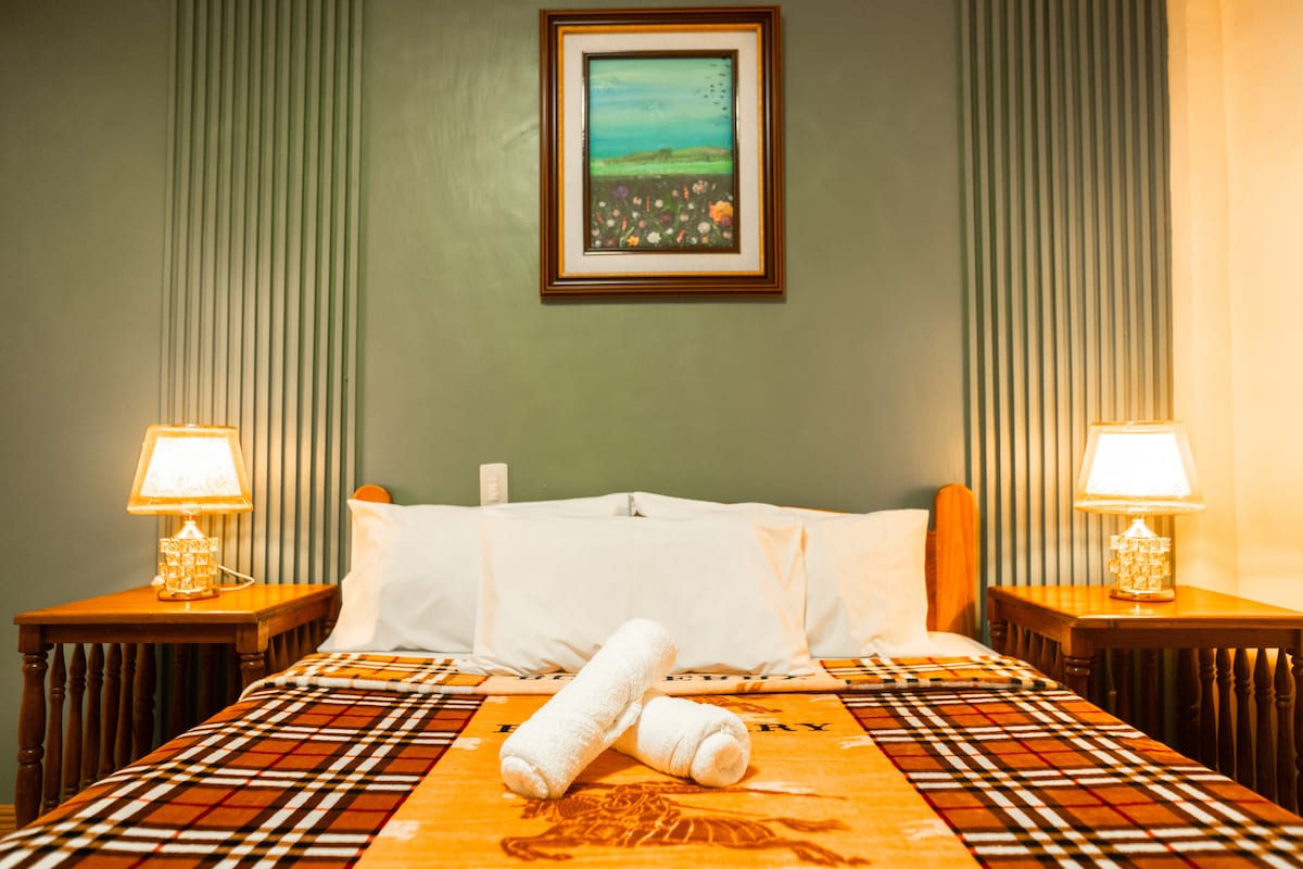 Deluxe Double room for 4 pax: - 2 double sized beds - 43" Cable TV - toilet with hot and cold shower, hair dryer and ring light mirror - one electric fan ( no Aircon ) -Free Wifi & Parking - small fridge cooler, coffee mugs and electric kettle - spacious, well ventilated and a good window garden view ** Kitchen and dining area unit available for your group's exclusive use for an additional charge payable upon check-in. * Walking distance to Burnham Park , night market, and public market.