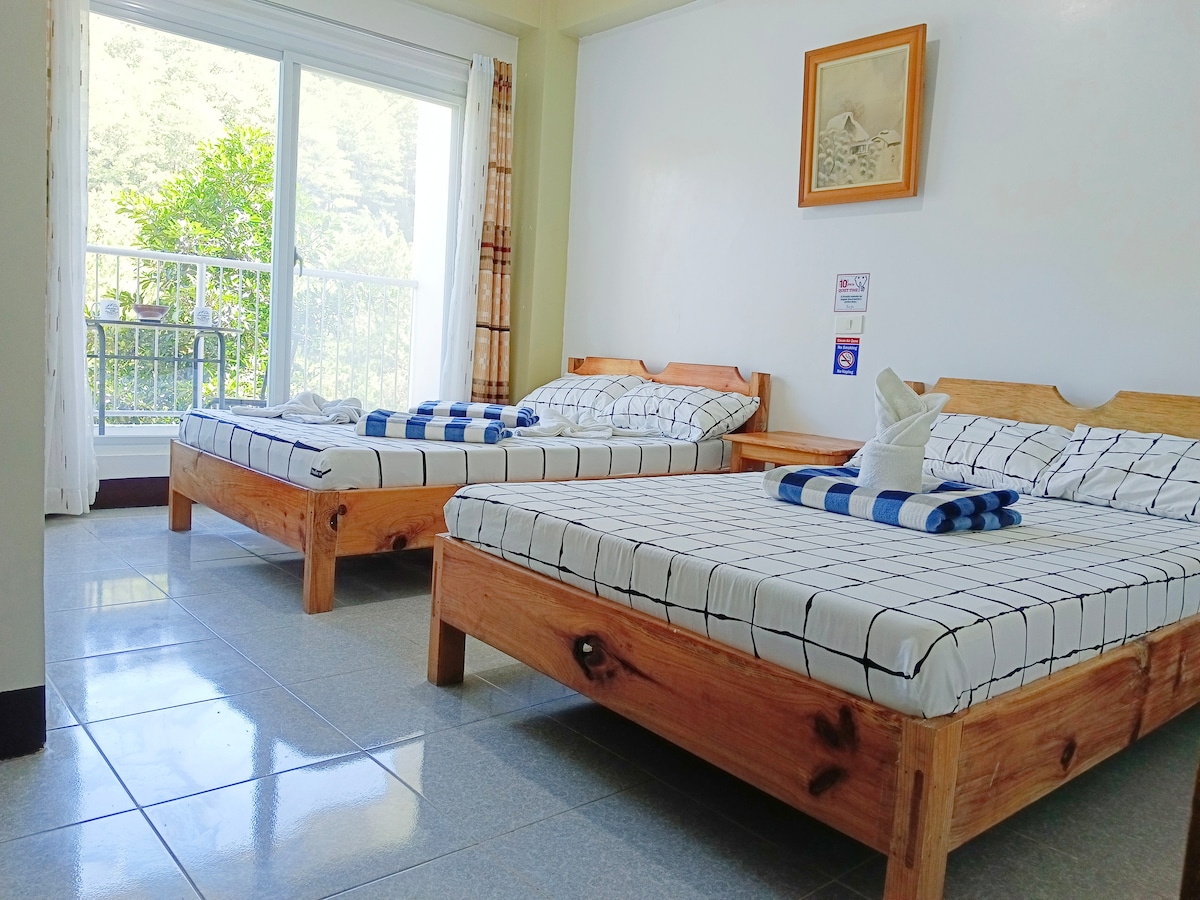 Amlangan Lodge room 10 is a private cozy room with 2 "double size" beds. It is located 2 floor levels down from the building entrance/lobby, dining with stairs to take. It has private toilet (with bidet) , sink, & bathroom (with hot shower) separate from each other, enabling guests to use these simultaneously & keeping the toilet floor clean, dry, & more comfortable. It has a balcony with a stunning view of pine forest & rock formations, which can also be viewed from your bed.