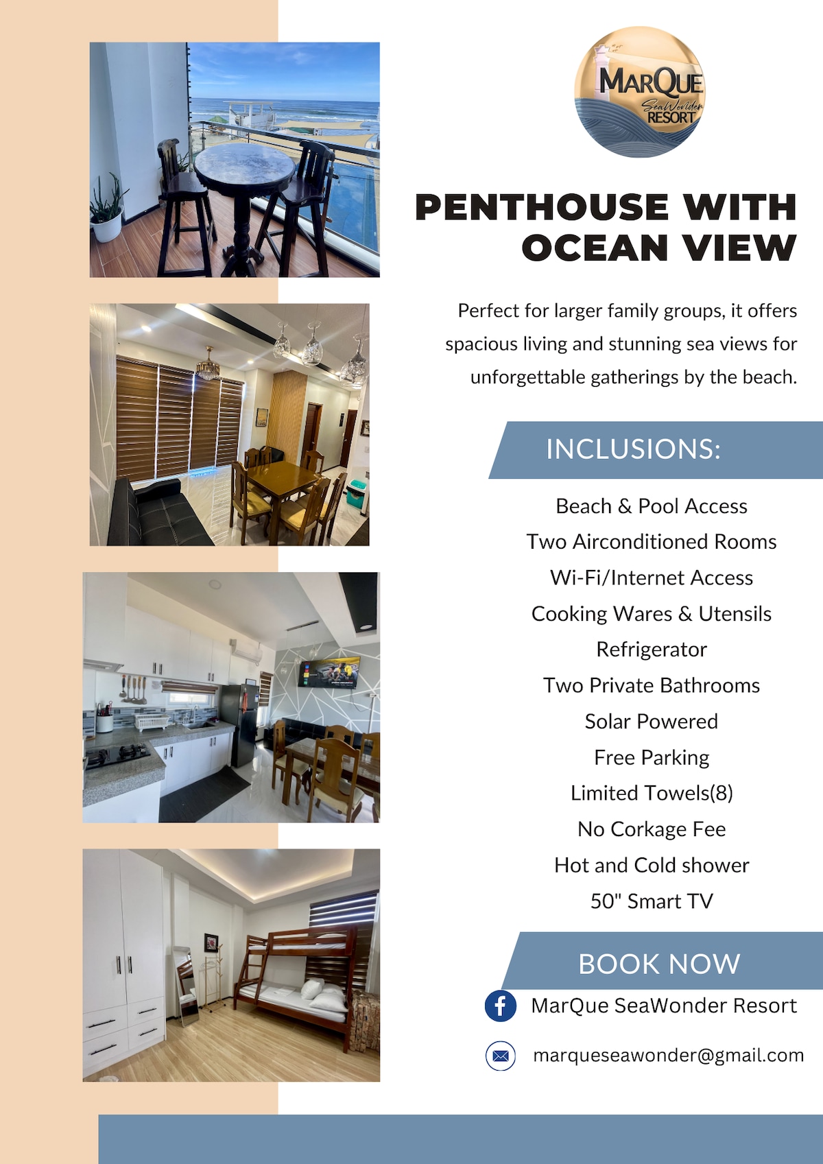 Located beachfront in Patar, Bolinao, Pangasinan this penthouse unit offers a tranquil coastal escape. You’ll fall asleep to the sound of crashing waves and wake up to sea breezes through floor-to-ceiling windows . • Bedrooms: 2 • Bathrooms: 2 • Sleeps: Up to 13 guests (ideal for large groups or family stays) • Type: Entire apartment with shared pool access • Fully equipped kitchen – perfect for preparing home-style meals •Parking space provided on-site