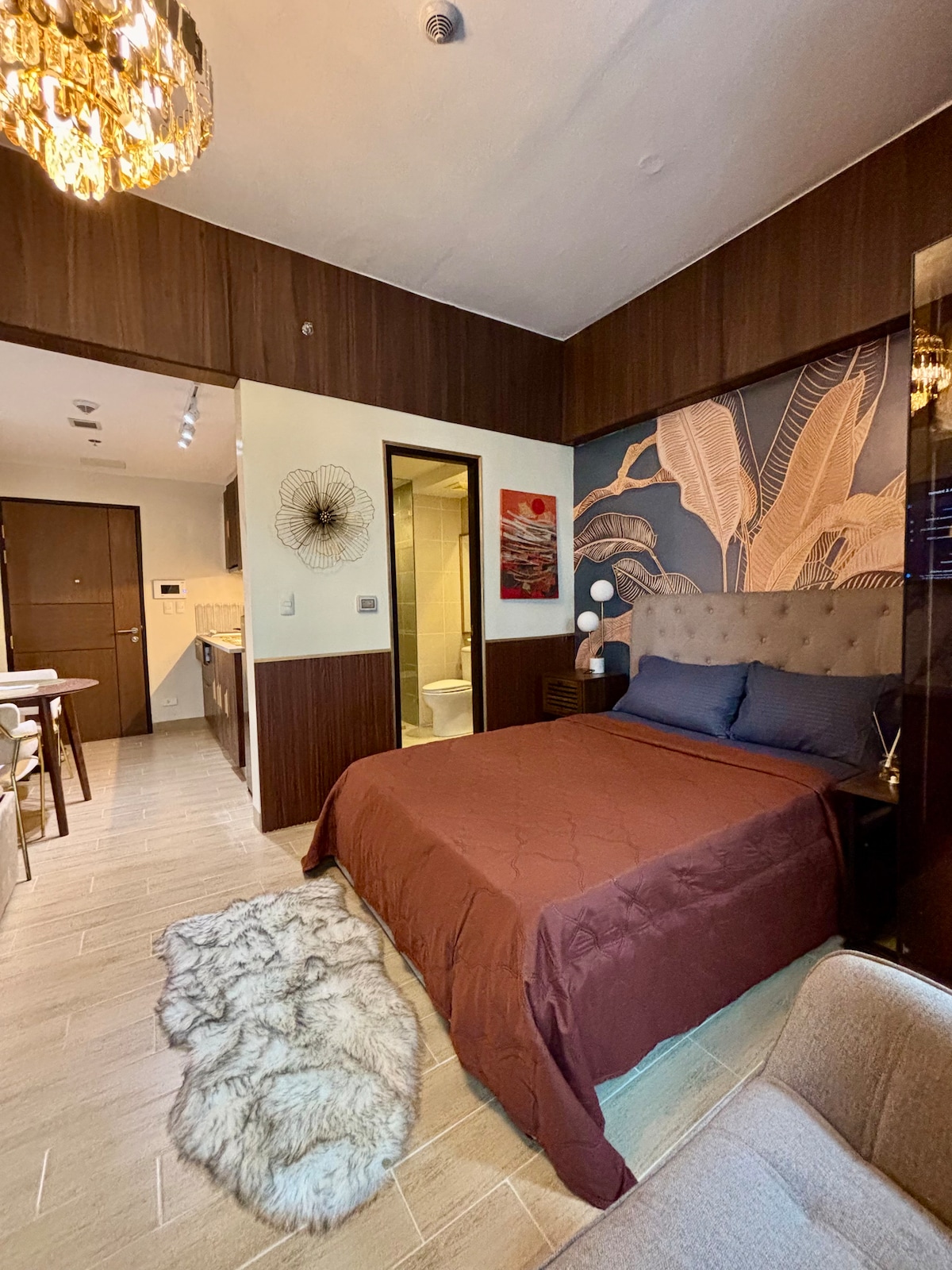 Inspired by rustic and minimalist design, this fully furnished studio is perfect for business or leisure stays in the heart of Iloilo. ✓double-size bed with pullout (up to 3 guests) ✓pool access ✓Wi-Fi ✓AC ✓Smart TV (with Netflix Premium) ✓Self Check-in. 🛍️ Walking distance to Atria Shops & Restaurants, QualiMed, Ateneo de Iloilo 🏙️ Near SM City, Festive Walk Mall, and Iloilo Convention Center 🛬 About 24–30 mins from the airport and 17–25 mins to Parola Wharf for Guimaras trips