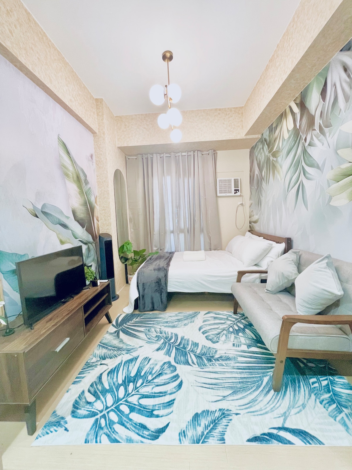 Kick back and relax in this calm, stylish space. Experience a tropical design vibe in this studio unit. The room features a cool tone of paints, artistic-tropical wall accents and soft ambient of lighting that create a cozy, relaxing atmosphere. Enjoy a comfortable bed, a chic seating area and a dining space perfect for meals or remote work. this place is perfect for unwinding after work or exploring Iloilo City.