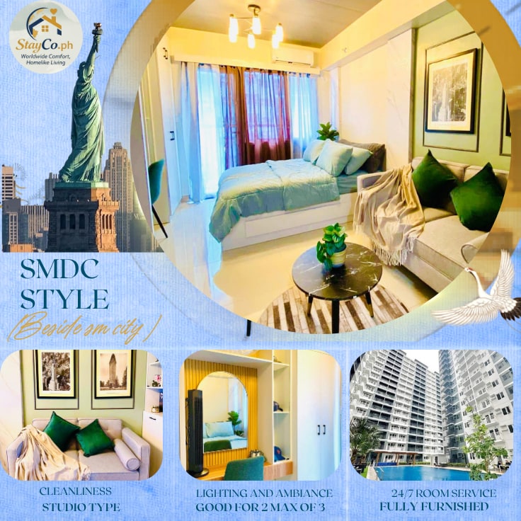 Spacious Fully furnished condo design perfect for family and staycation. Includes home furniture (sofa, Smart tv with Netflix, cable TV and fast internet, 6-seater dining table), full kitchen (rice cooker, induction cooker, range hood, electric water heater, dining sets and utensils, pots pans). 2 air conditions, Beds (king Size, Double, Single pull out bed). T&B (bidet, hot and cold). Drying cubicle for laundry on Roof top. Amenities: Pool, gym, billiards, play house for kids and a clubhouse.