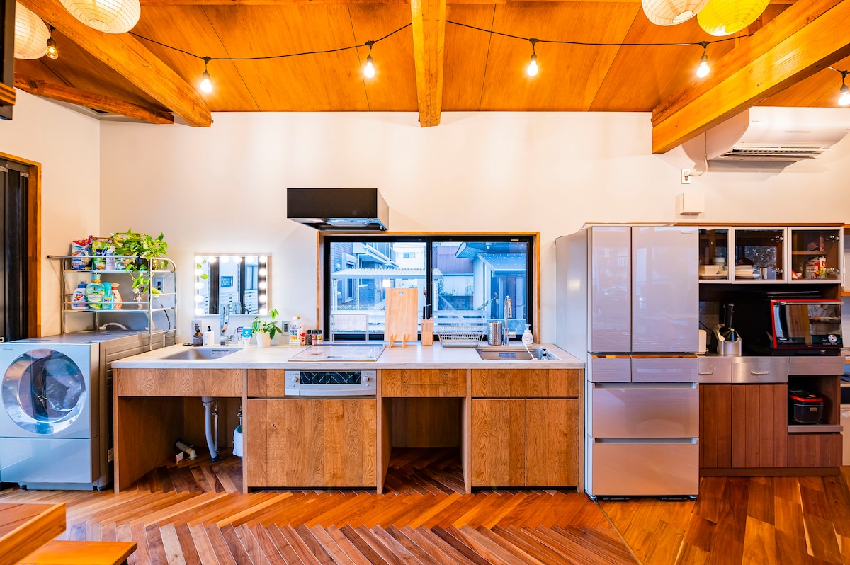 这间宽敞的1LDK公寓设计明亮开放,环境舒适。配有两张小型双人床和一张双层单人床,可容纳最多4位客人。客厅的大窗户面向绿色庭院,自然光洒满整个空间。一天的游玩之后,在这个温馨的空间中好好放松、恢复活力。屋顶露台非常适合悠闲放松,夏天还能欣赏烟花。屋顶还有一个露天浴池(建议穿泳衣)。从今治站步行即可到达,是探索岛波海道的理想据点。非常适合情侣、家庭或来自海外的游客。