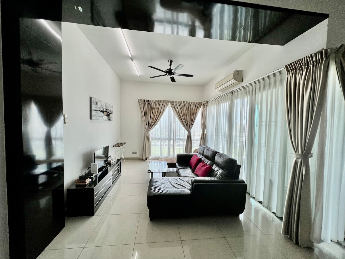 Stunning Sea view from the house. Chilling at the balcony. Swimming pool@level 6 Living Room, Queen Size bedroom, private sofa bed corner with curtains. Ensuite bathroom with hot and cold water shower. Large refrigerator with ice cube , mini kitchen with electric cooker, pot,plate,spoon,fork are available . Light cook at the kitchen. Filter water machine hot and warm. Please select 3 guest if you need single bed setting convert from sofa bed.