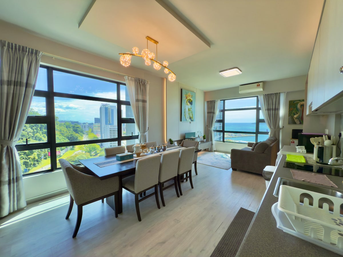 New condo located at CBD and by the sea bay. Enjoy sea view surrounded with islands at our high floor unit. Walking distance to Jetty with convenience for island hopping; SABAH International convention centre, (Duty Free) Jesselton mall and Suria Sabah mall is nearby. Our Homesuite is clean with frequent sanitizing. Family friendly and also suitable for couples and business trips.