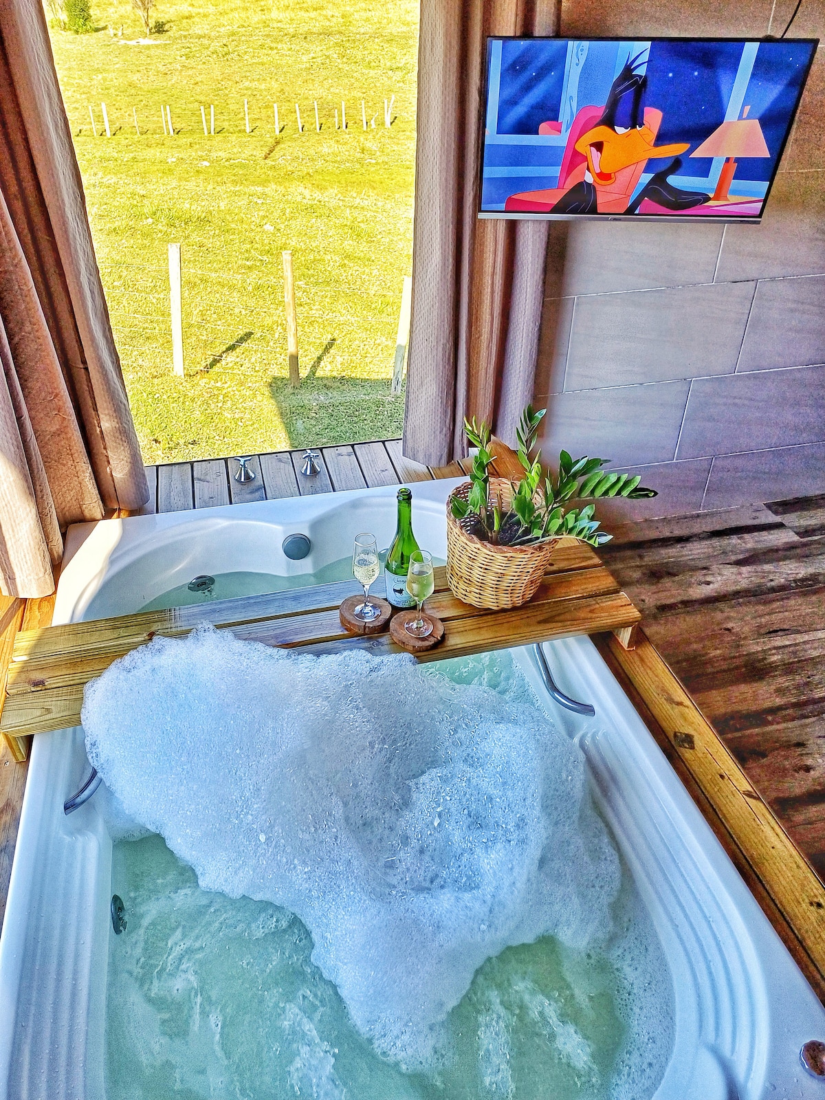 Você vai adorar a decoração estilosa deste charmoso lugar para ficar. Quem cresceu no campo conhece o prazer de acordar com o cantar do galo, comer frutas frescas, correr pela estrada de cascalho e respirar ar puro. É uma paciência gostosa, uma paz que envolve a alma, a mais autêntica das felicidades. O chalé suíte da chácara das Estrelas surge com a experiência do campo e ao mesmo tempo é aconchegante e romântico com uma vista única para as montanhas em torno da nossa bela cidade de Imaruí.