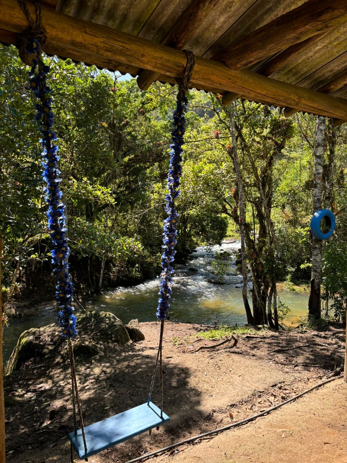 Cozy countryside house surrounded by nature. The porch wraps around 180° of the house, featuring a pier extending to the small pond, a barbecue area, and a spacious deck with a rope hammock—perfect for watching the sunset over the mountains. The small pond in front of the house also serves as a natural swimming pool, ideal for cooling off. Its strategic location allows you to enjoy both the countryside and the beach. Easy access, with only 1.5 km of dirt road.
