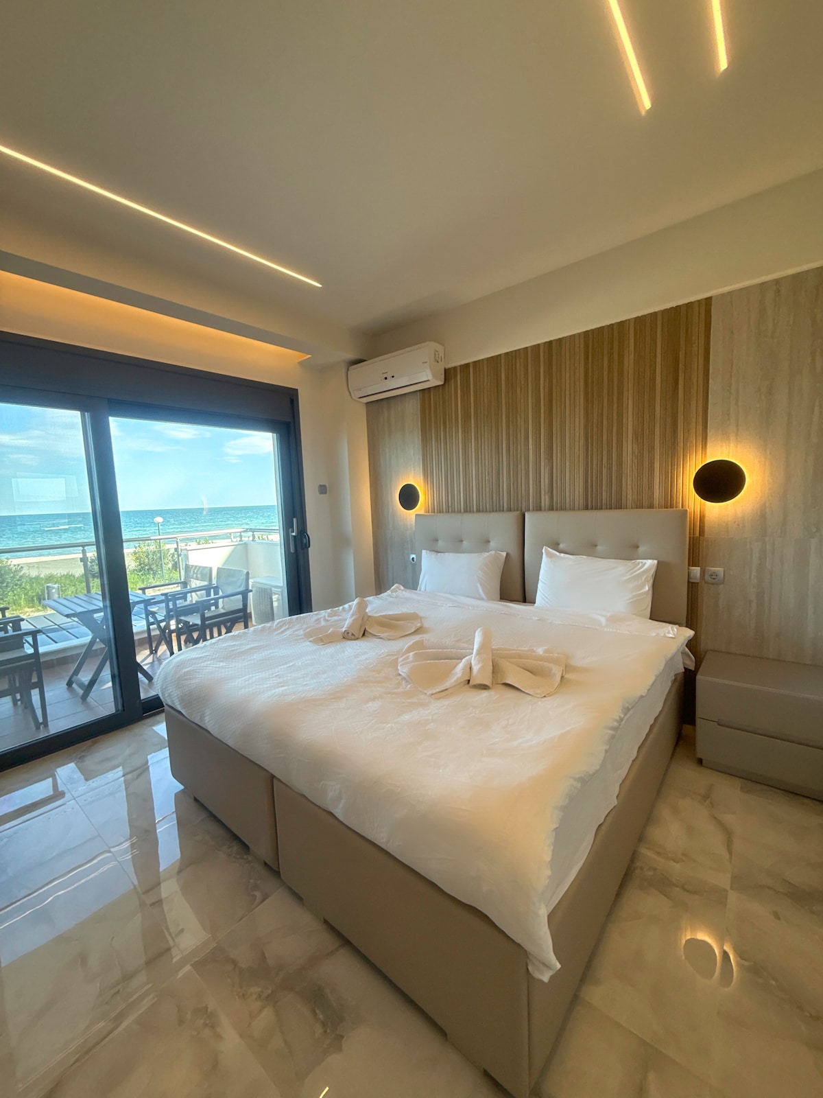 Beachfront paradise, quiet environment, beautiful decor, luxury linen & towels, fully equipped kitchen, cooking-dining essentials, aircond, WI-FI, washer & many more 5* amenities to make your stay comfortable & pleasant, large balconies with unobstructed views of the blue sea & city lights across the bay, spend your evenings dining in the balcony watching the beautiful sunsets or walk the sandy beach, dreaming Greek vacation..