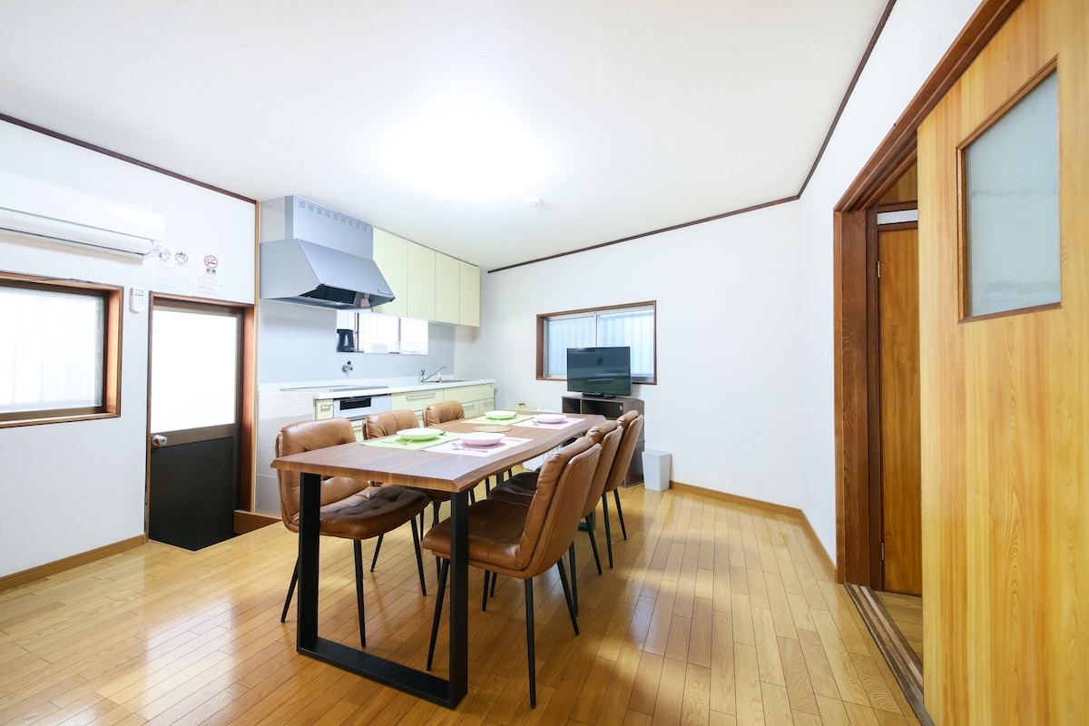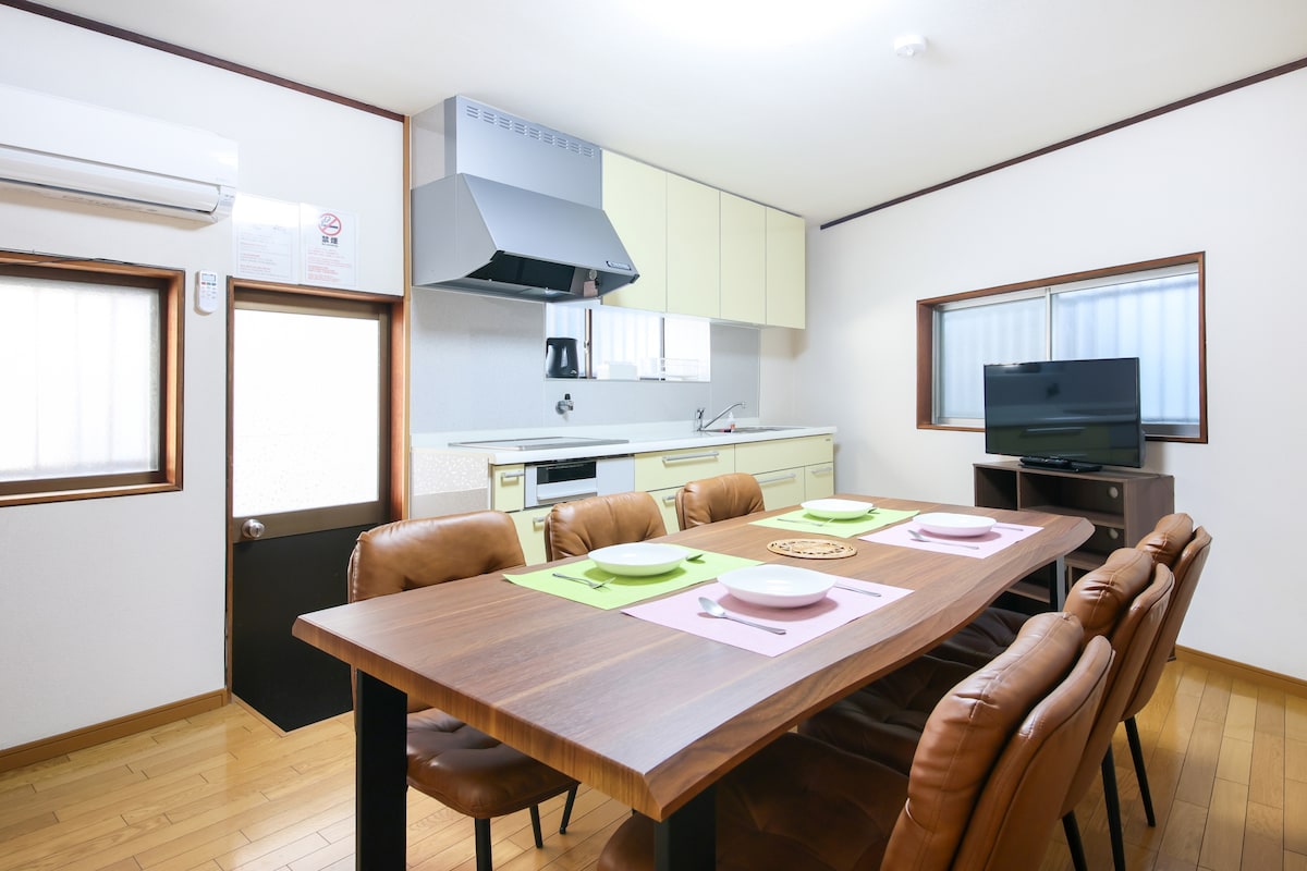 近鉄今里駅から徒歩3分、大阪メトロ新深江駅から徒歩6分の平屋の一軒家です。 上り下りが必要ありませんのでご年配の方々にもお勧めです。 閑静な住宅街にあるので落ち着いた時間を過ごしていただけます。 難波まで20分、日本橋まで15分。奈良へも1時間以内で行けますので大変便利に使用いただけるかと思います。 全自動洗濯機と専用乾燥機の両方が完備されてますので、長期の滞在でも快適にご利用いただけます。 ベッドはセミダブル x 1、シングル x 6なので最大8名までご利用いただけますが、推奨人数は6名です。 【設備】 ・無料Wi-Fi ・6人がけテーブル1台、椅子6脚、補助椅子2脚 ・衣類乾燥機 【洗面設備】 ・シャンプー、リンス、ボディソープ ・タオル8枚、バスタオル8枚 合計 ・洗濯機 ・ドライヤー 【キッチン設備】 ・お皿8枚 ・グラス8個 ・フライパン・鍋 ・包丁・まな板 その他の特記事項 ・15~21時チェックイン ・10時チェックアウト ・パーティーは禁止です ・隣の家と壁が繋がっているため、22時以降は静かにお過ごしください。 ・室内、玄関先は完全禁煙です。