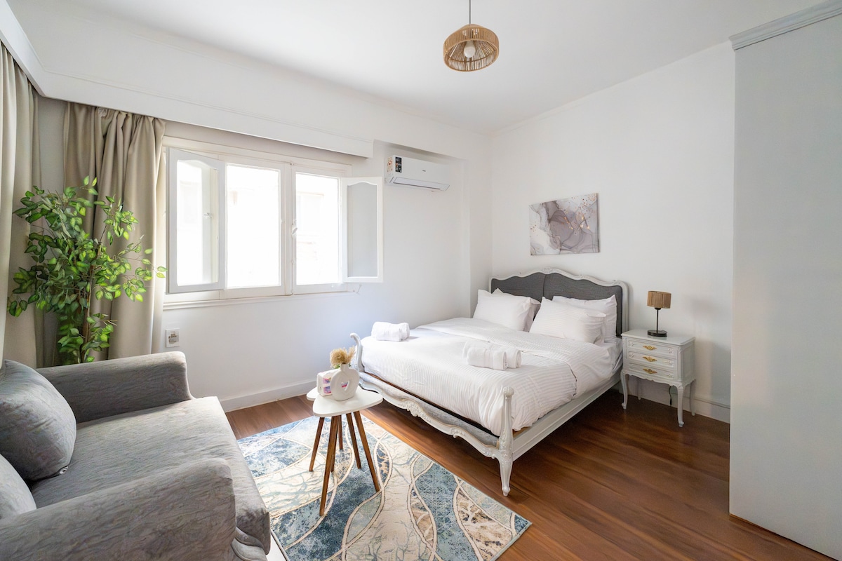 Tucked in a quiet neighbourhood, the one-bedroom boutique studio is your home away from home while you explore Cairo city. The studio's location gives a good connection to most of the city's popular areas. Our space comfortably fits 3 people. To ensure the safety of our guests, we follow the guidelines and recommendations of the Egyptian government and the WHO.