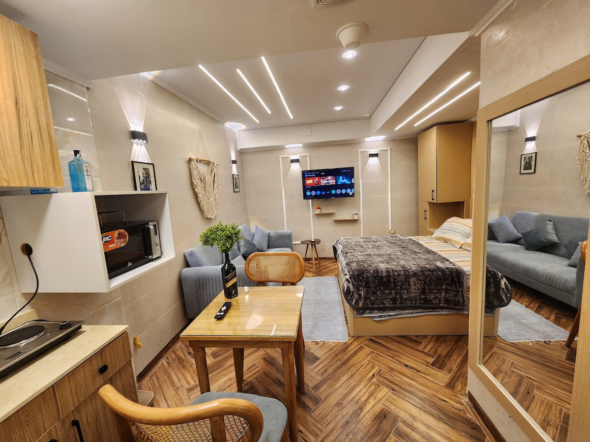 استرخ في هذا المسكن الهادئ والأنيق الزمالك الساحرة و بالقرب من التاريخ والمزارات والفنون والخدمات المتعددة ستوديو غرفة واحدة تتسع لفردين وتمتاز باثاث انيق مكيفة بها كل الأجهزة. ليس هناك شباك يطل على الشارع فهي غرفة داخلية لكن مزودة بنظام تهوية فعال وتكييف ساخن بارد و سرير كبير. ودولاب واريكة سرير و مائدة طعام ومطبخ مجهز بكل الأجهزة المكان ليس في شارع ابو الفدا. المكان يقع في قلب الزمالك في شارع طه حسين بجوار سينابون وبافلو برجر وكشري افندينا و اليمامة سنتر المبنى قديم نوعا لكن حيوي جدا