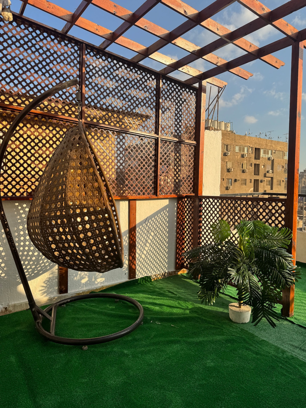 This is apartment 4 from our 6 units complex, in which all units have access to a shared rooftop that Has a outdoor jacuzzi , outdoor swing and picnic table . Newly renovated green house apartment located in a very prime and quiet location in zamalek a very strategic location for guests that are interested in visiting some of Cairo’s most attractions, The apartment is Equipped with all necessary luxury electronics and magical view overlooking a garden and a pool