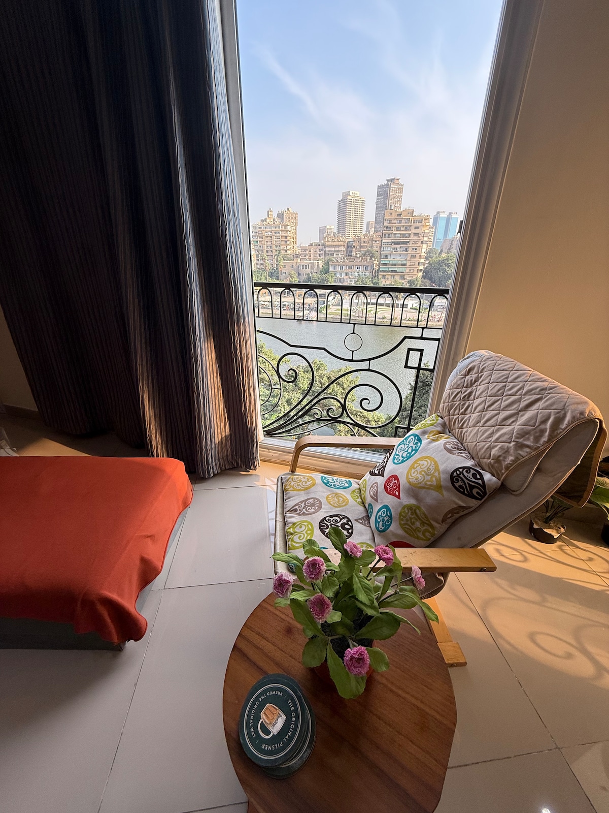 Your front-row seat to the Nile where you can enjoy the morning light on the river. the Nile is part of your day—coffee by the window, an evening walk on the corniche, an easy return home. Indoors: fast Wi-Fi, a 55-inch smart TV, and a fully equipped kitchen. At night, settle into hotel-grade Egyptian-cotton linens; noise-insulating windows, electric shutters, blackout curtains, and steady A/C keep the room cool and dark for deep sleep.