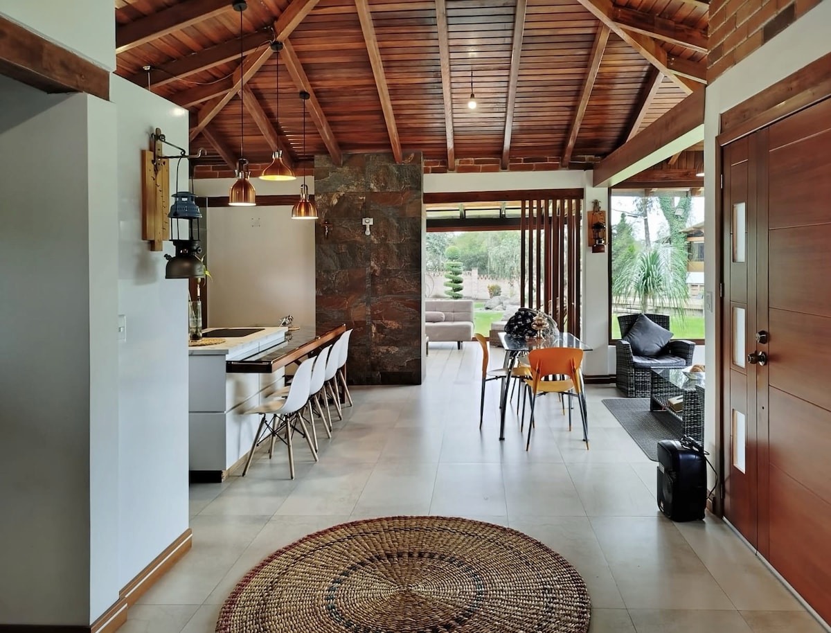 Nuestra casa del lago, fuciona el diseño industrial con calidez, madera y ladrillo, y brinda un descanso perfecto y base ideal para conocer la encantadora zona de Otavalo. Estamos a 20 min. del Mercado de los Ponchos, 50 minutos de las Lagunas de Mojanda, 20 min. de Cayambe, 40 min. de Cotacachi, etc Disfrute de noches acogedoras con dos chimeneas, un calentador exterior eléctrico y en la terraza un fire pit que les acompañarán a disfrutar los atardeceres más bellos de la sierra.