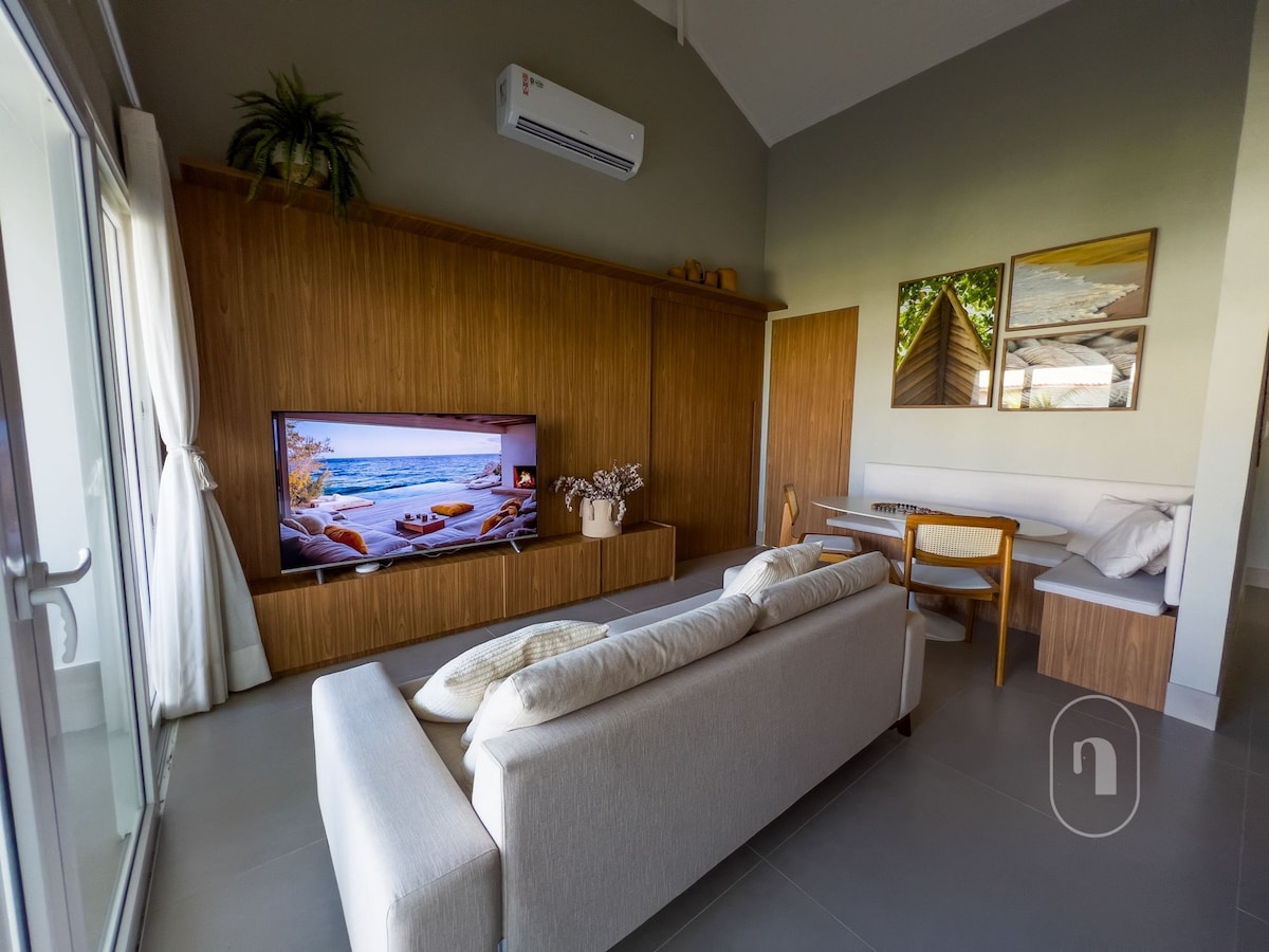Dentro do novo, moderno e ecológico complexo turístico Reserva Imbassaí ao lado do Grand Palladium Resort. Apartamento de alto padrão com praia privativa, condomínio fechado, varanda gourmet com churrasqueira, 65m2, quarto com ar condicionado, sala ampla com ar condicionado, o sofá da sala equivale a 2 camas de solteiro conjugadas, área de serviço, cozinha equipada. O apartamento é decorado com excelente acabamento. Com WiFi, Smart TV e SKY. Guarita 24h e Ronda 24h.