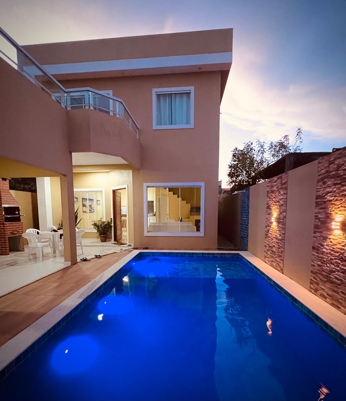 Casa luxuosa, espaçosa e confortável ! Possui 04 suítes com ar-condicionado, acomoda confortavelmente um total de 10 pessoas. Área de piscina com móveis confortáveis e hidromassagem. Area gourmet finamente decorada e equipada, com churrasqueira, telão 72”e home theater bluetooth, adega, cervejeira, geladeira, chapa e forno com todos os utensílios. Wi-Fi no interior e área externa para lazer, home office e estudo. Área externa gramada com campo futebol, rede removível para voleibol ou futvôlei.
