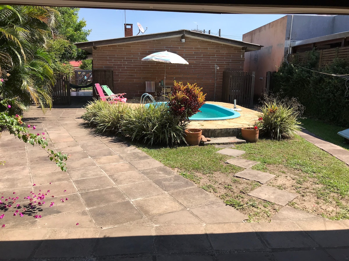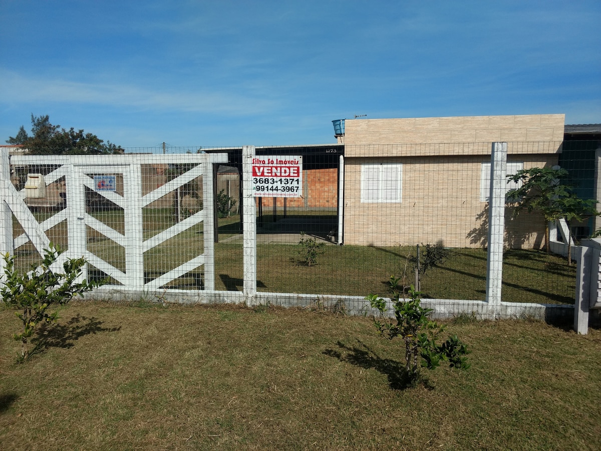 Casa a 5 quadras do mar (350m) com piscina enorme e um pátio gigante para você aproveitar o verão com sua família e amigos! A casa possui um quarto com cama beliche e outro quarto com cama de casal no mezanino, dois banheiros externos (somente um deles com chuveiro), cozinha completa e equipada (com fogão, forno, cafeteira, liquidificador e utensílios). Sala de estar com tv com canais abertos e 3 sofás e uma bicama A casa possui churrasqueira na área interna e um quiosque ao lado da piscina.
