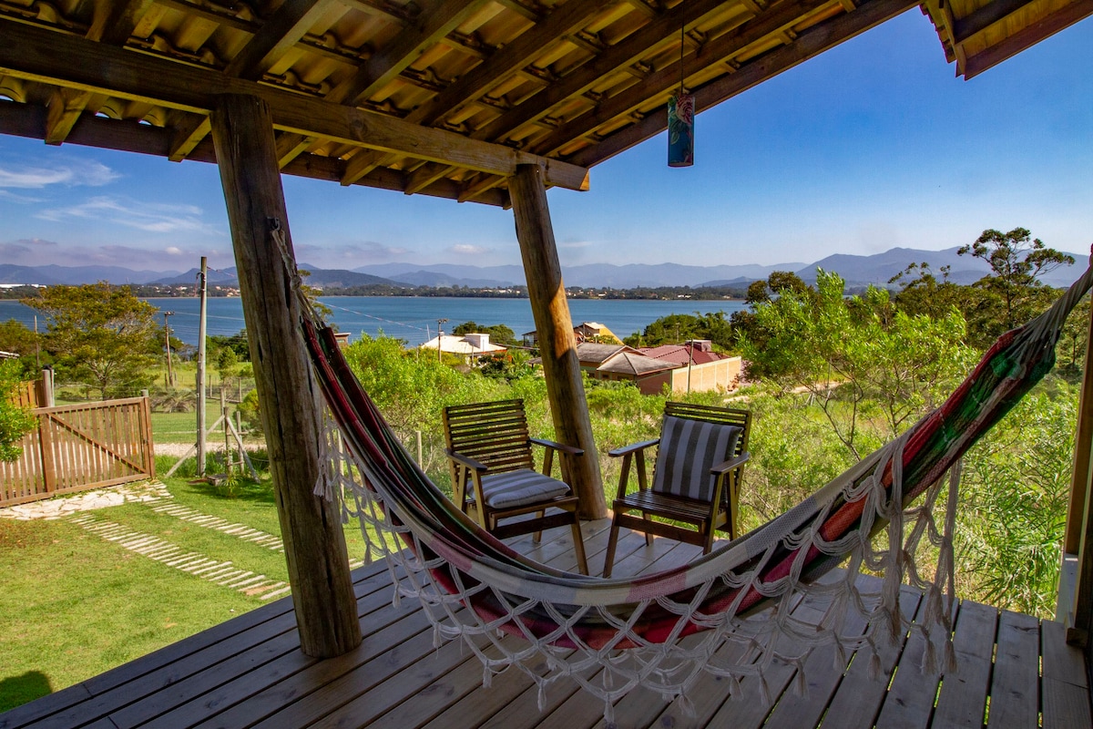 Chalé no alto do morro próximo do mar e com a uma vista das montanhas e dunas que proporciona um fim do dia com o por do sol maravilhoso,acesso a praia dos amores e d'água por trilhas . Ambiente muito agradável e seguro, com ar condicionado e wifi. estamos localizados em Imbituba na praia da Ribanceira 5 minutos da barra de Ibiraquera 10 minutos praia da vila 20 minutos da praia do rosa isso usando o carro.