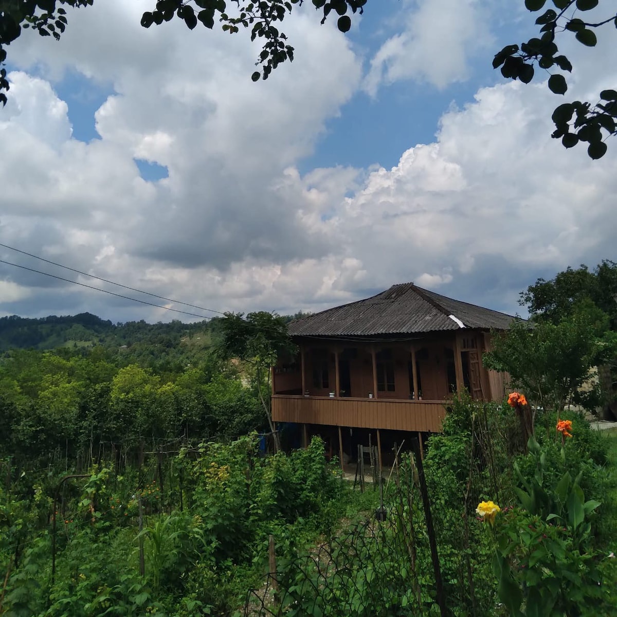 our cottage made with natural wood ,wich is organic and good for healthy. living room is big,have forest and mountain view .you can make fire in the fire place ,see the amazing view and feel the sound of river and birds singing. You can come ,hike 5 km and see most highest waterfull in Georgia , see Martvili canyon,taste foods which is made with organic ingredients.we offer you spring water ,which is very good in winter period.we have a wood oven and house is very warm in winter.
