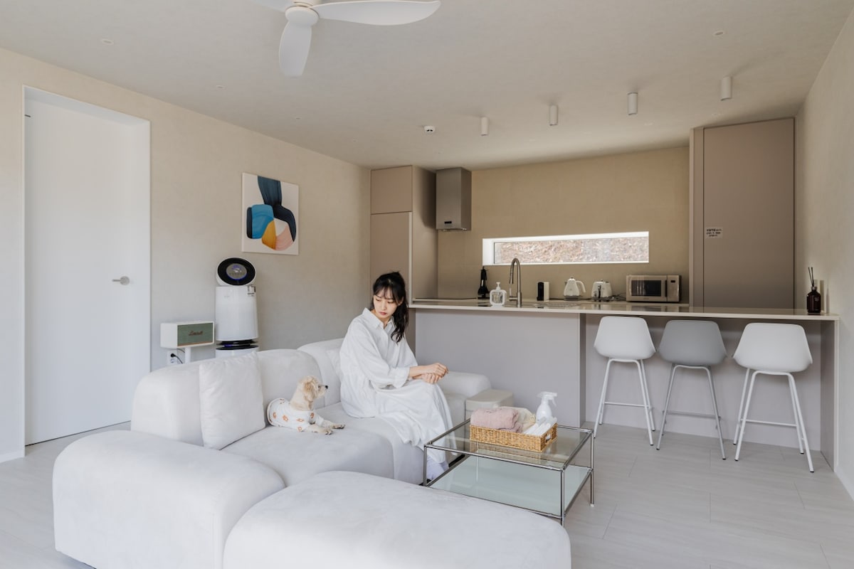 숙소에서 자동차로 3분거리의 바다 200평의 넓은 대지위에 25평의 안락한 오직 한팀만을위한 비대면 독채감성숙소입니다 넓은 도로옆의 마을입구이지만 민가와 50여m떨어져있어 주변의 시선과 소음을 전혀 방해받지않는 비대면의 프라이빗한 숙소입니다 침실 두개는 퀸사이즈침대와 슈퍼싱글 사이즈 2개를 준비하여 정원 4분이 편히 쉬실수 있는 공간을 준비하였으며 추가인원이 있을시 1인은 거실에 침구를 마련해 드립니다 선명한 8k 85인치 대형TV 로 넷플릭스의 영화를 즐길수있습니다 바닷가와의 거리도 차로 3분거리 서프비치 12분거리의 숙소입니다 주차후 정원에 낮고 예쁜 계단이 20개 있습니다 혹시라도 불편하신 게스트님은 예약중 참고하세요