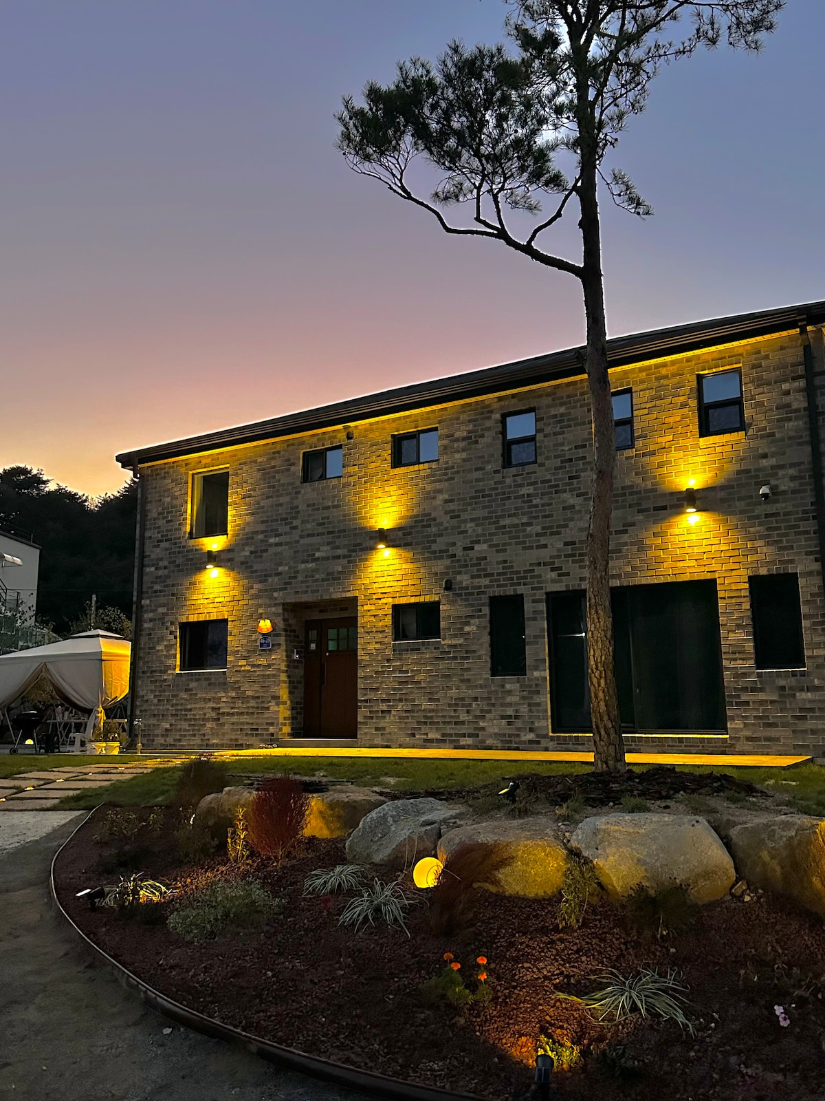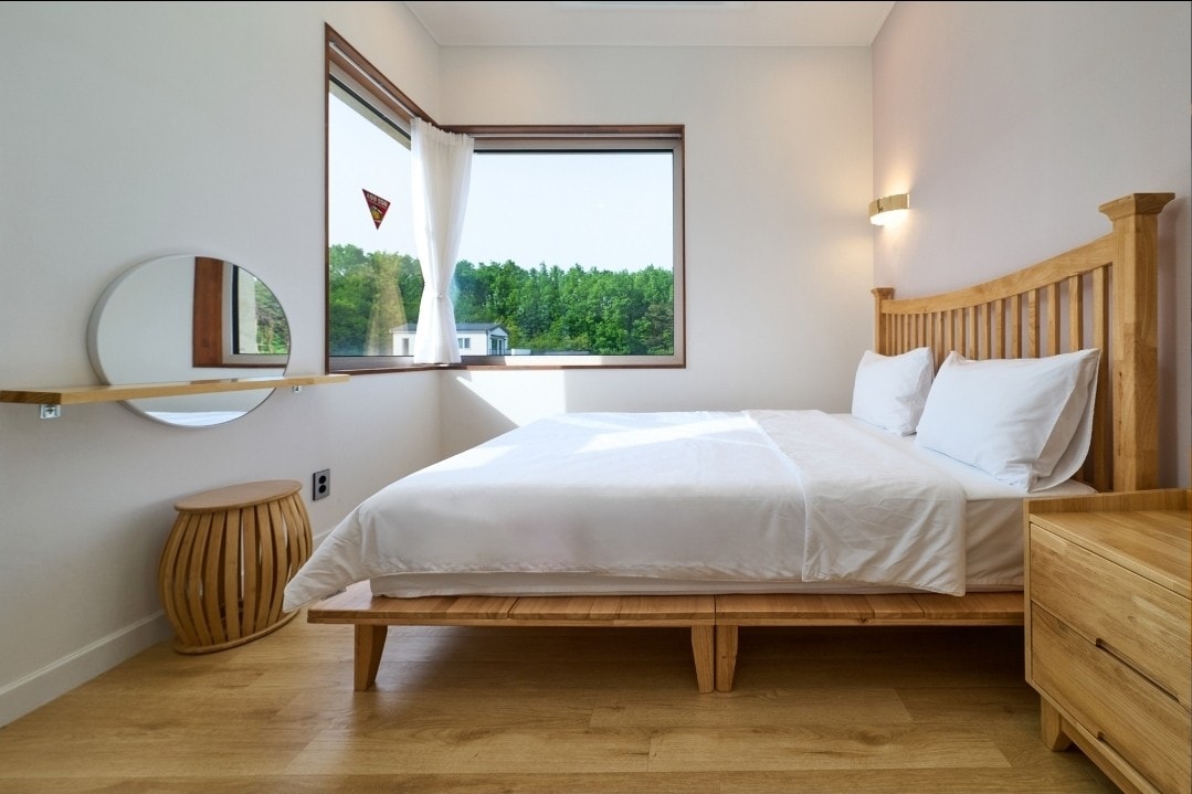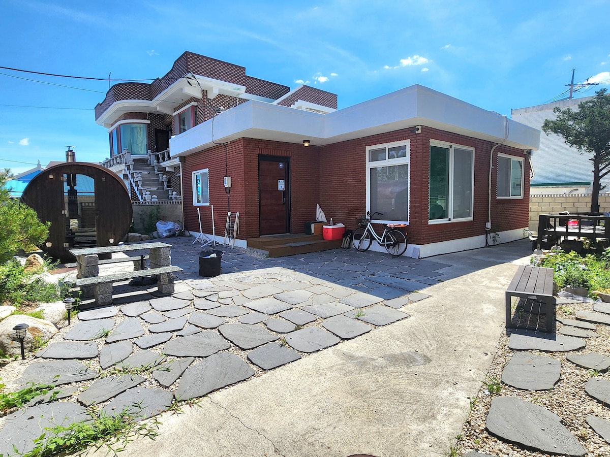 Three rooms, three bathrooms, free barbecue for all seasons! It's a large double-decker pension of 27 pyeong The standard number of people is 5 and up to 6 people! It's a two-story pension You can enjoy the great scenery through a large window throughout the house Change bedding every day There is an air conditioner in each room, a toilet bidet installation, and a washing machine. You can use a large lawn of 200 pyeong in front of the pension