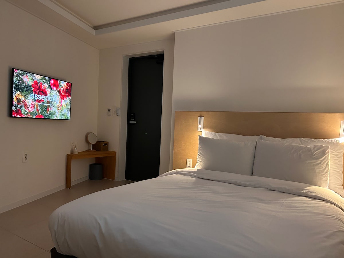 <모던한 스타일의 원베드룸> -디지털도어락 -미니 냉장고 세팅 -객실 내 취식가능 -개인 화장실 -에어컨 & 바닥난방 -티비시청가능 -헤어드라이기,고데기,화장솜,면봉,샴푸,샤워젤,수건