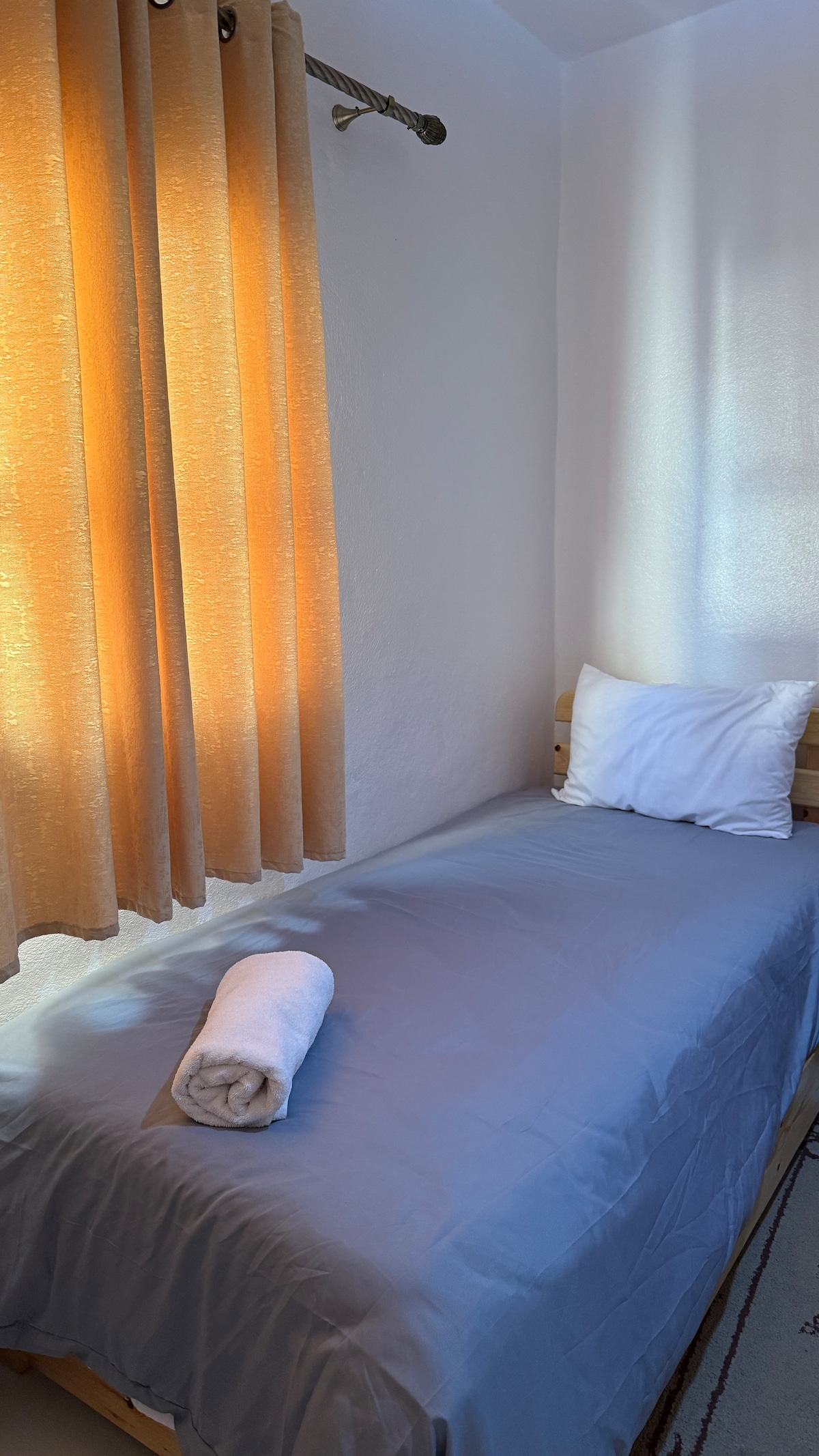 Cozy twin room inspired by the traditional charm of Fez, offering a peaceful and bright space to relax after a surf day. Located on the second floor of Nomazigh Surf House, guests can enjoy access to the chill terrace, co-working area and a rooftop with ocean view. Just a short walk to local bakery (1 min), Happy Tamraght restaurant (2 min), and Manzili Co-working (4 min). Close to popular surf spots like Devil’s Rock and Banana Point.