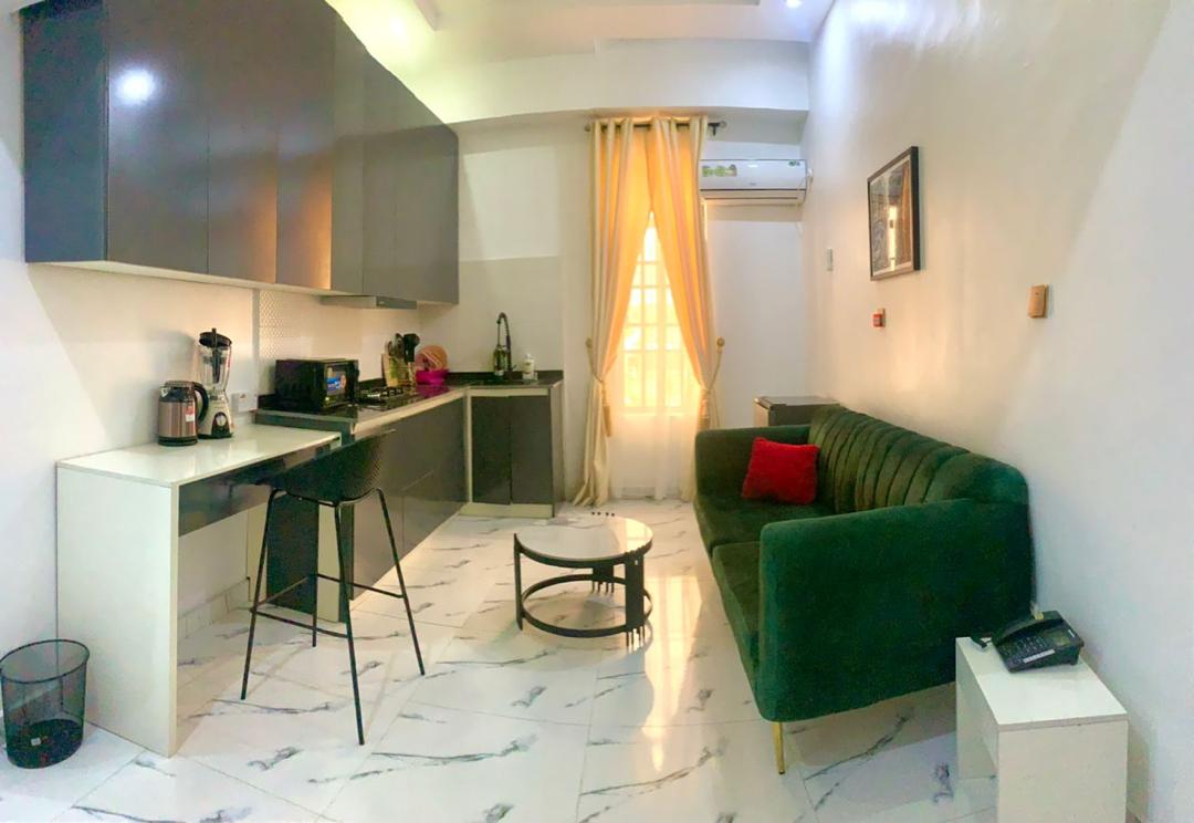 This cozy apartment features one bedroom with classy wardrobe and fans Sitting room with television air condition fans and work place Modern equipped kitchen with gas stove fridge freezer toaster kitchen utensils and microwave Bath room with shower situated in a gated community and built in a gated spacious compound with free parking and renowned security Provision for three exterior cameras supported with flood light .Solar powered 24 hours coolness backed up with 40 KVA generator.