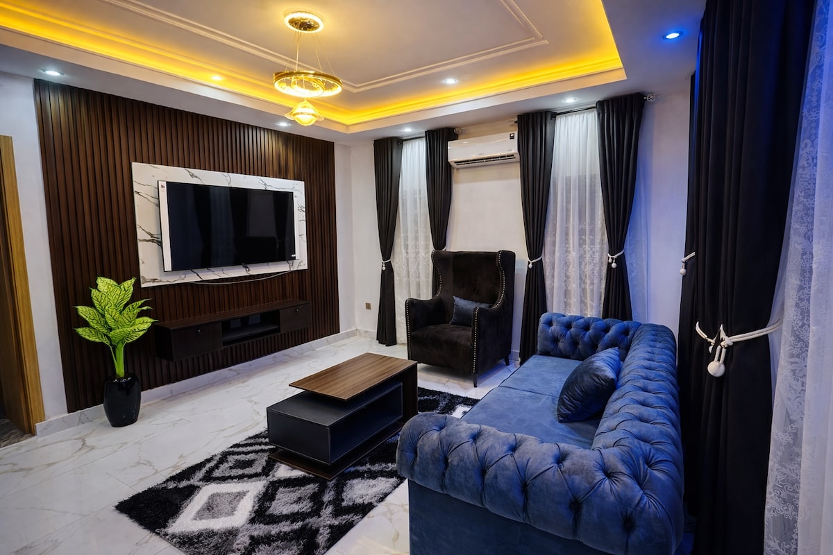 AUDEMARS Luxury One-Bedroom Suite Enjoy comfort and elegance in this fully furnished one-bedroom apartment. It features a spacious ensuite bedroom, stylish living room, smart TV, fast Wi-Fi, and a fully equipped modern kitchen. Benefit from 24/7 power supply and WHO-standard treated water. Guests also enjoy access to the pool, rooftop lounge, bar, snooker, and dart area. Secured with exterior CCTV and armed security for your peace of mind. Perfect for business or leisure stays.