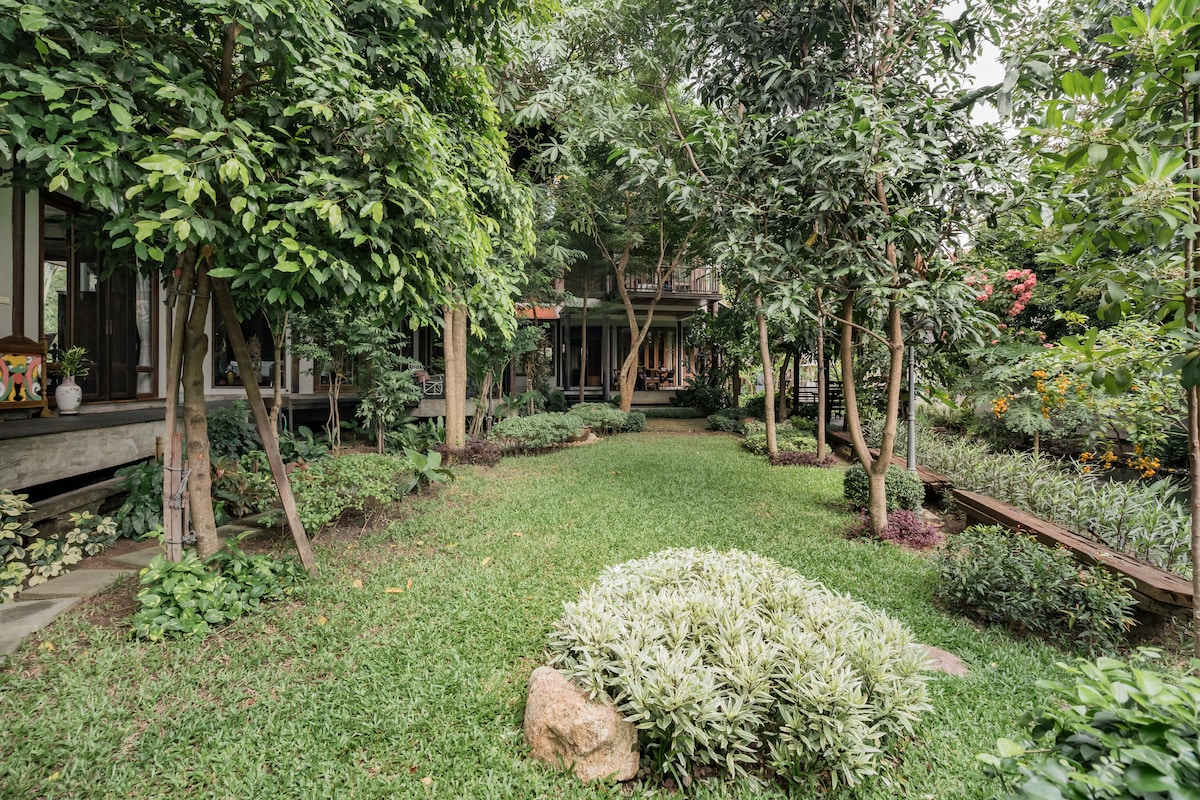 Make breakfast in the open-air kitchenette and dine in a breezy spot in the shade. The secluded unit is set in a traditional style architecture home with wood finishes throughout, contemporary furnishings, pops of color, and lush gardens. Big trees and sounds of variety of birds feature its natural atmosphere. Located in a safe area of an inner Bangkok suburb, about 30 minitues from Suvannabhumi airport and less than 30 minitues from city centre.