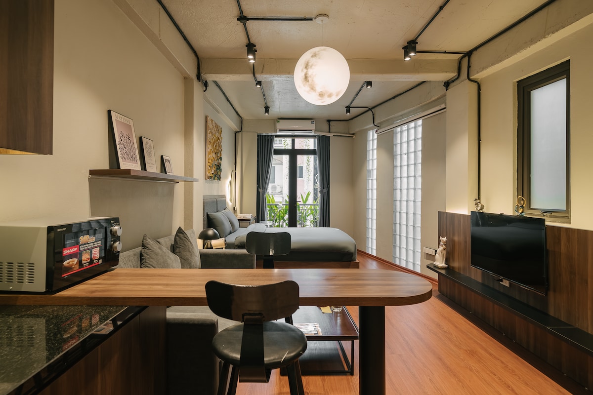 Just a few steps away from the Old Quarter, crossing the serene ground hall a harmony of wooden frames, greens, swimming koi, and up to this cultured, compact apartment. With a glass wall ready let the soft daylight shine through. In such a compact space, every detail should be considerate, modern, and optimized for a comfortable living. Lightings hand picked by the boss to bring coziness, Indochine decors and other vignettes in dark wood tones to feel perfectly .