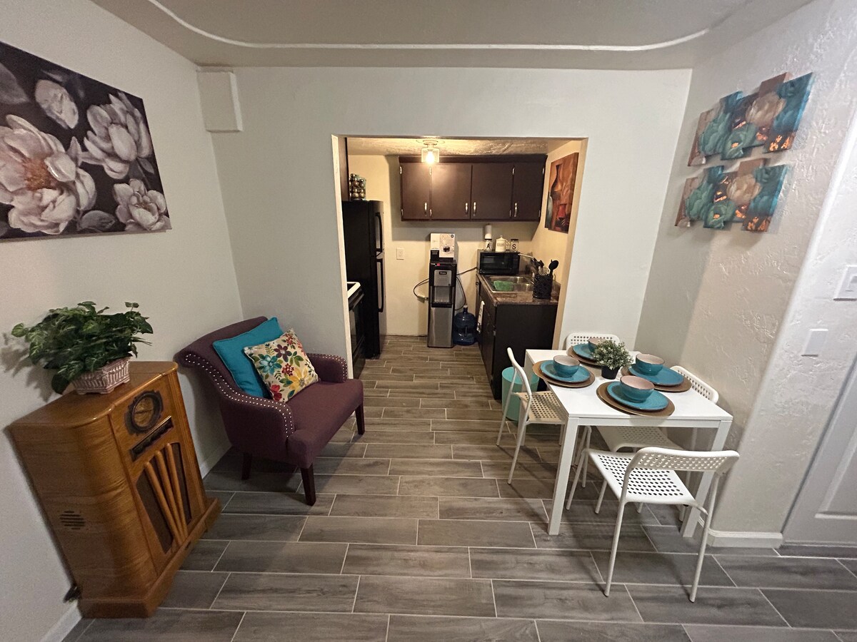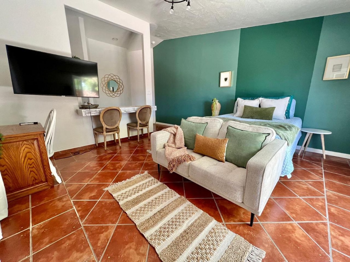 Welcome to our charming second-floor studio, exuding a vibrant desert-themed ambiance nestled in the heart of Downtown Yuma Historic District. Immerse yourself in the local culture with easy access to a plethora of restaurants, lively bars, and picturesque walking paths along the majestic Colorado River. Our goal is to provide you with a unique, modern, and impeccably clean space to ensure an unforgettable stay. Two bicycles included with each reservation.