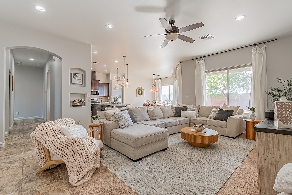 Experience elevated comfort in this spacious, serene retreat, thoughtfully designed for discerning business and leisure travelers. Ideally located, the home features brand-new Samsung smart appliances, a swimming pool, an arcade game, and a grill/smoker. Enjoy refined indoor comfort, stylish gathering spaces, and ample parking for up to five vehicles, including RVs and desert vehicles. Whether lounging poolside or unwinding indoors, this property offers a truly exceptional stay.