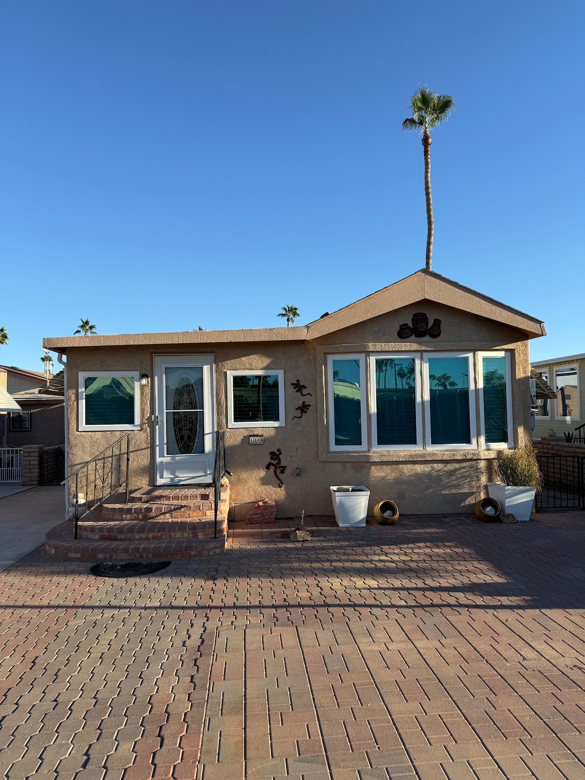 Peaceful mobile home. relax in the sunroom with privacy screens, take a break and unwind at this oasis. It may look small but it’s actually very roomy and cozy. Seating areas in back yard, side az room and large new propane bbq for evening grilling. Parking for 2 cars under carport at least one person must be 55 via contact me email Please be aware This is Yuma desert there is sand and winds