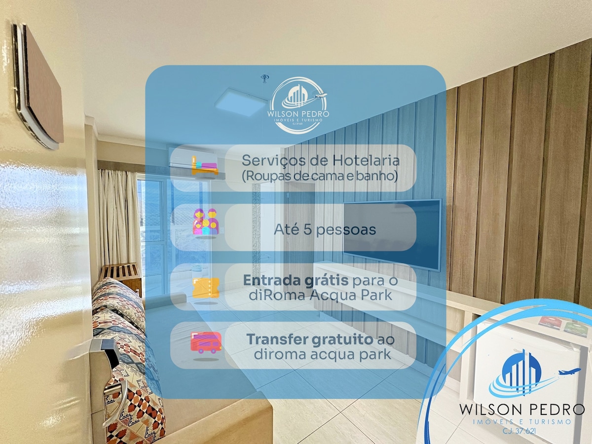 Apto c/ cama queen size no quarto; outra cama casal normal na sala e colchão de solteiro extra, 2 tvs de Led, ar condicionado, geladeira, purificador de água, fogão elétrico, panelas, copos, pratos e talheres, microondas, sanduicheira, parque aquático c/ 12 piscinas, piscina de ondas, toboágua, bares, restaurante e estacionamento. *OCUPAÇÃO MÁXIMA: 05 PESSOAS. CRIANÇAS DE COLO TAMBÉM CONTAM.* *TAXA DE OCUPAÇÃO:R$10,00/PESSOA(QUALQUER IDADE). *ROUPA DE CAMA/BANHO, PAGOS A PARTE.
