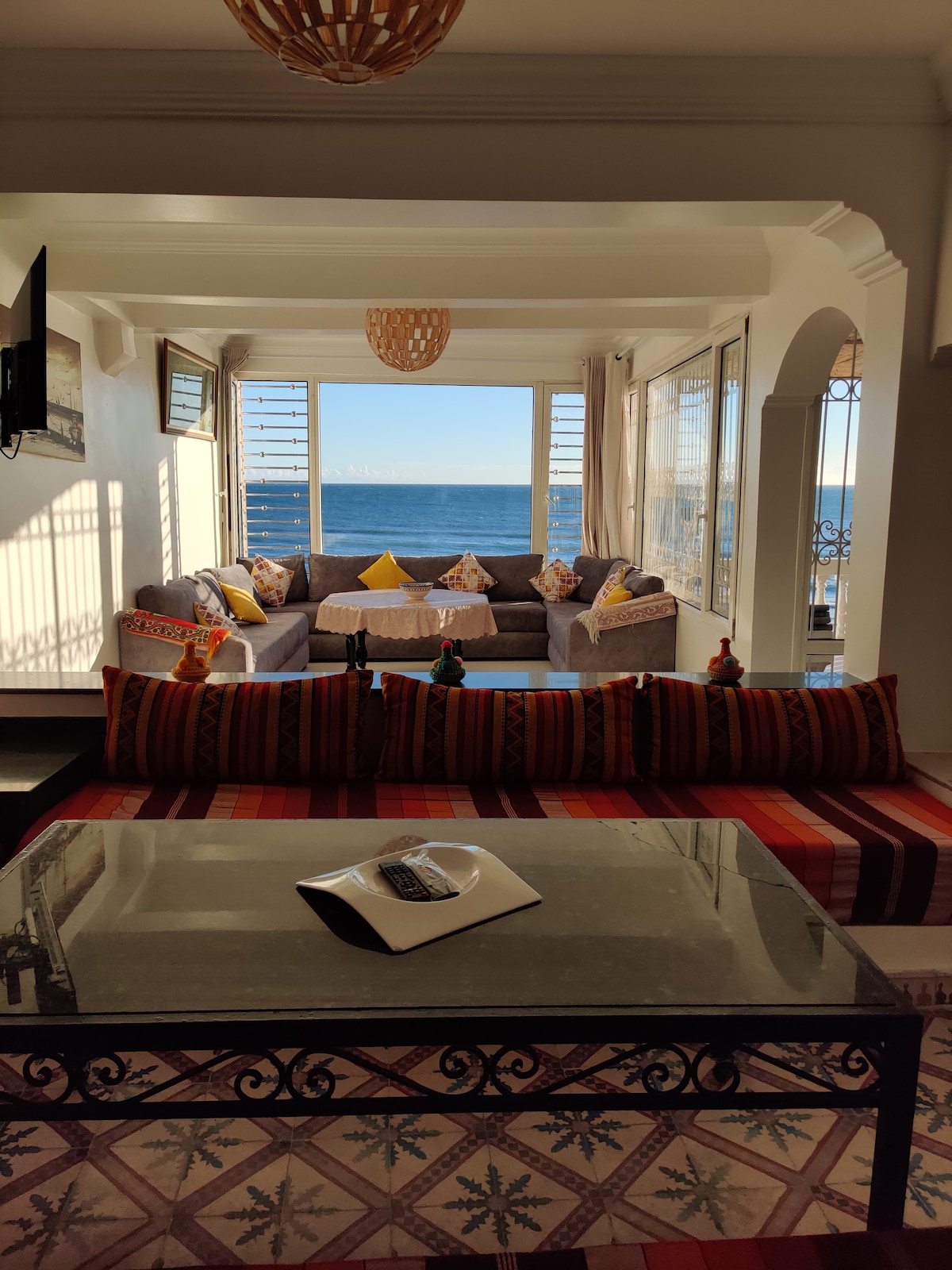 Beautifully designed 2-bedroom flat on the first floor, spacious and tastefully decorated in a warm Moroccan style. 🛏 1 double bedroom, 1 twin bedroom, plus a large sitting room with traditional settees that can sleep 3 extra guests. 🍳 Open-plan, fully equipped kitchen. 🛁 2 bathrooms with showers and toilets. 📶 Full Fibre Optic WiFi throughout. Enjoy free access to the rooftop terrace with breathtaking ocean views over Imsouane — perfect for morning coffee or sunset relaxation.
