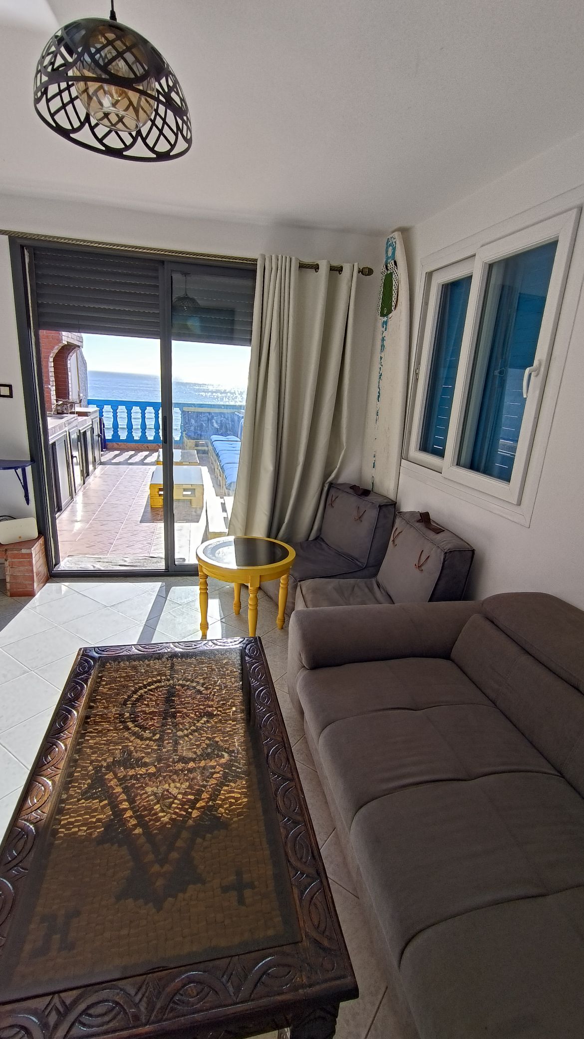Les enchantements des couchers de soleil d'Imsouane depuis la terrasse. *Au 1er niveau - Une chambre avec un grand lit (1,80m/2m)+salle de bain privée. - Une chambre avec 2 lits (0,90m/2m) - Une salle d'eau lavabo-WC. - Un hammam / douche. - Un beau salon avec 2 banquettes et un balcon. *Au 2ème niveau - Un séjour avec deux grandes banquettes. - Une cheminée - Une cuisine super équipée - Un Lavabo-WC - Une grande terrasse avec salle à manger