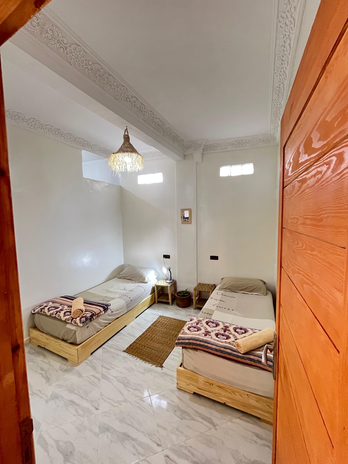 Beautifully designed 2-bedroom flat on the first floor, spacious and tastefully decorated in a warm Moroccan style. 🛏 1 double bedroom, 1 twin bedroom, plus a large sitting room with traditional settees that can sleep 3 extra guests. 🍳 Open-plan, fully equipped kitchen. 🛁 2 bathrooms with showers and toilets. 📶 Full Fibre Optic WiFi throughout. Enjoy free access to the rooftop terrace with breathtaking ocean views over Imsouane — perfect for morning coffee or sunset relaxation.