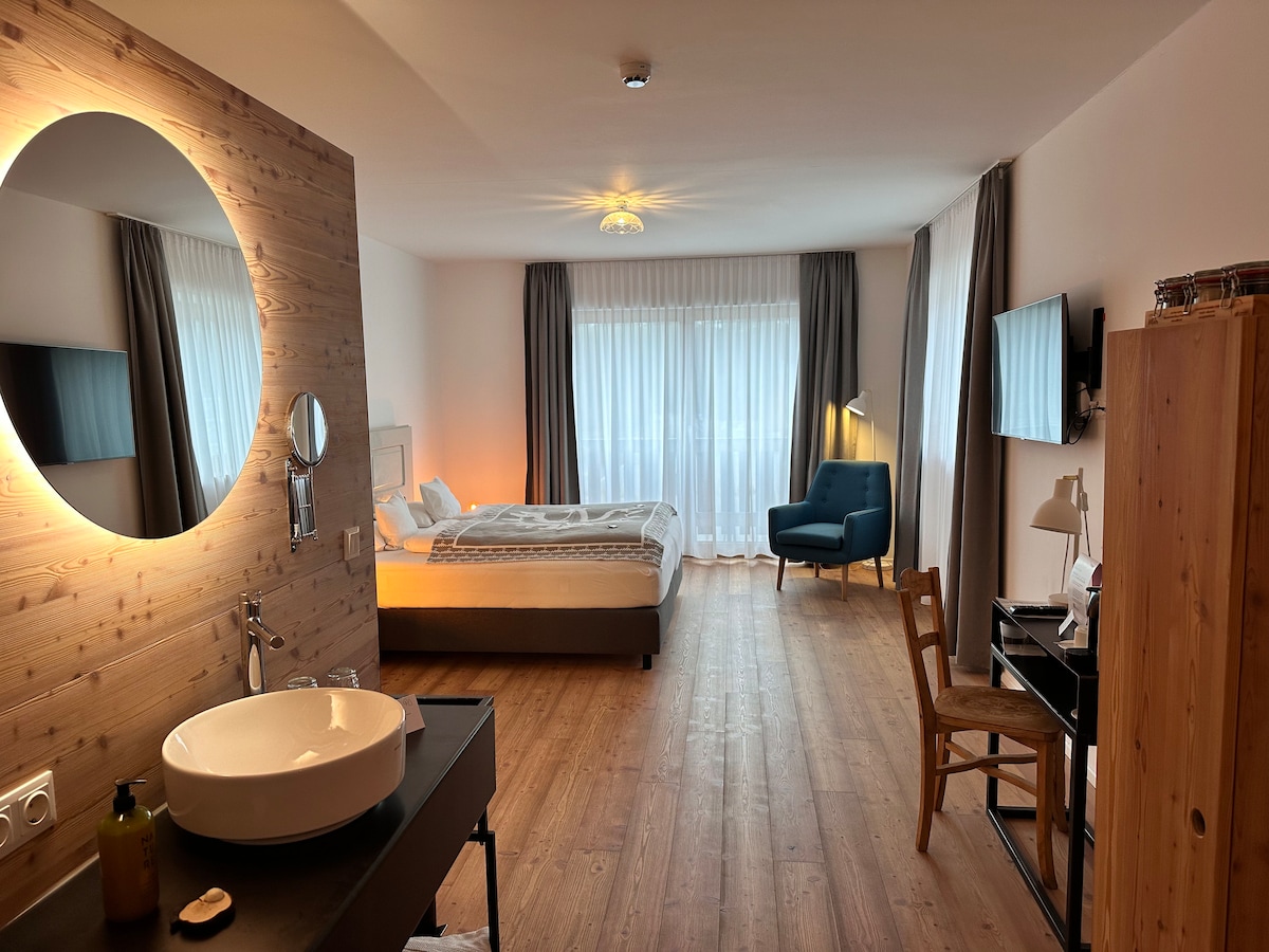 Diese besondere Unterkunft hat einen ganz eigenen Stil. Die modern, mit allem Komfort ausgestattete ebenerdige Wohnung liegt im südwestseitigen Trakt in einem Einfamilienhaus im Landhausstil. Es finden 4 Gäste in einem Doppelbett und auf einer Doppelschlafcouch bequem Platz. Die Terrasse mit Gartenanteil lädt jederzeit zum sonnen, chillen und grillen ein. Unsere Gäste genießen Natur pur direkt am Jakobsweg mit wunderbarer Kulturlandschaft, riesigem Waldgebiet und tollem Bergpanorama.