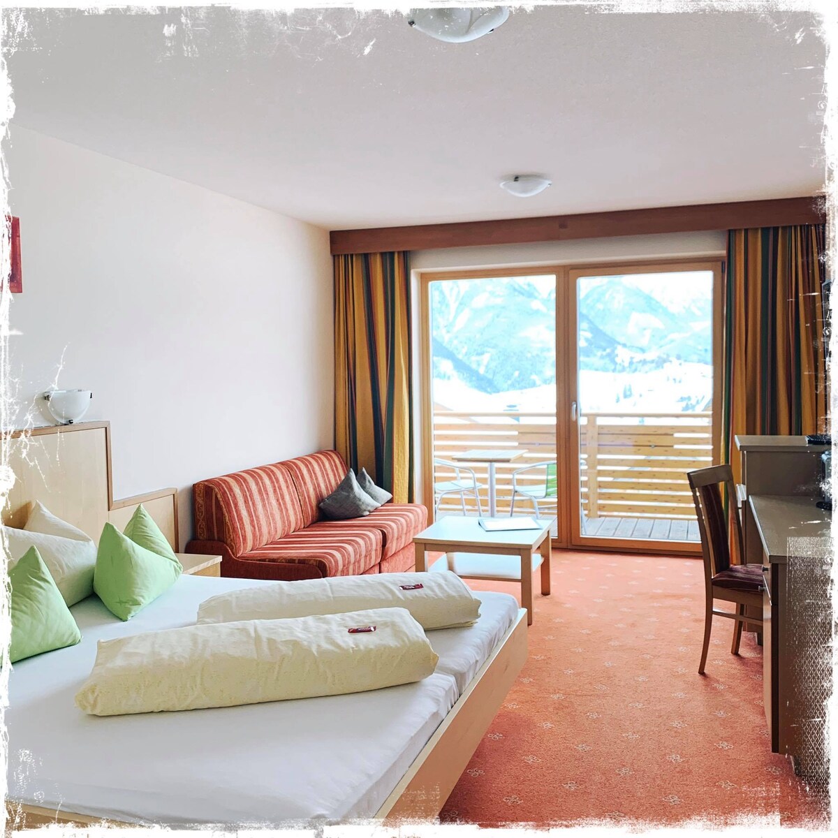If you are looking for a flat in a central location, the perfect starting point for skiing in winter, hiking/biking or motorbike riding in summer, you have found it here. The garage can also be used for motorbikes. 2x car parking spaces directly in front of the garage are included in the package. There are 2x bedrooms (optional large pull-out sofa bed in the living room) -2x bathrooms (1x bathroom en suite, 1x in the corridor) washing machine, tumble dryer and a sauna barrel on the balcony