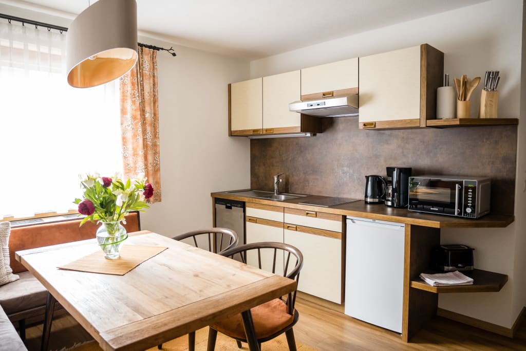 Appartements zum Wohlfühlen ... Appartements Melanie verfügt über eine sehr schöne Küche , Wohnzimmer , Bad mit Dusche und WC und Föhn , gemütliche Sitzgruppe , eigenem Essplatz , Sat TV , Radio und vieles mehr verfügen. Die Küche ist mit einer Komplettausstattung wie Geschirrspüler , Mikro, 4 Feld Kochplatte , Backrohr , Kühl und Gefrierschrank , Kaffeemaschine , Wasserkocher , komplettes Geschirr und Besteck , usw. Eigener Parkplatz.